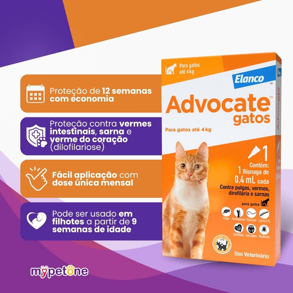 ✅ Aplicação prática; ✅ Previne a Dirofilariose; ✅ Auxilia a desinfestação do ambiente; ✅ Ação imediata sem precisar picar o animal; ✅ Eficaz no tratamento contra pulgas por 4 semanas; ✅ Pode ser aplicado logo após o banho e tosa, com o pelo seco; ✅ Trata e previne os principais vermes intestinais redondos de cães e gatos; ✅ A partir de 7 semanas de vida do cão/ A partir de 9 semanas de vida do gato; ✅ Indicado para o tratamento para o tratamento de sarnas: sarcóptica, demodécica e otodécica. * Consulte sempre o Médico Veterinário de sua confiança para o uso apropriado deste produto. Leia a bula ou informações descritas na embalagem. Detalhes: O Antipulgas Elanco Advocate para Gatos até 4 Kg é indicado para a prevenção e tratamento das infestações por pulgas, sarcóptica e demodécica e os vermes intestinais em gatos até 4 kg de peso. *Consulte sempre o médico Veterinário de sua confiança para o uso apropriado deste medicamento. Leia a bula ou informações descritas na embalagem. Dicas Especiais: - Modo de Usar: Recomenda-se primeiro banhar o animal, aplicando o produto em seguida, uma vez que o pelo e a pele estejam totalmente secos; O produto é de sabor amargo, portanto pode ocorrer salivação se os gatos lamberem o local da aplicação imediatamente após a aplicação, o que não significa um sinal de intoxicação e normalmente desaparece após alguns minutos. Apenas em casos isolados que sinais neurológicos transitórios podem ser observados, caso o animal lamba o local da aplicação após o tratamento; O produto pode ser usado seguramente em fêmeas em qualquer fase da gestação ou da lactação, em gatos jovens (a partir de nove semanas de idade) e idosos; O tratamento de animais fracos e debilitados deve ser criteriosamente avaliado pelo Médico Veterinário; Ao tratar animais criados em grupo, recomenda-se separá-los, não permitindo que lambam o produto aplicado sobre a pele dos companheiros; Em caso de irritação, desconforto ou sensibilidade, o gato deve ser banhado demoradamente, com água morna e sabão neutro em abundância, pelo menos três vezes seguidas para remoção do produto. *LEVE SEU GATO REGULARMENTE AO VETERINÁRIO