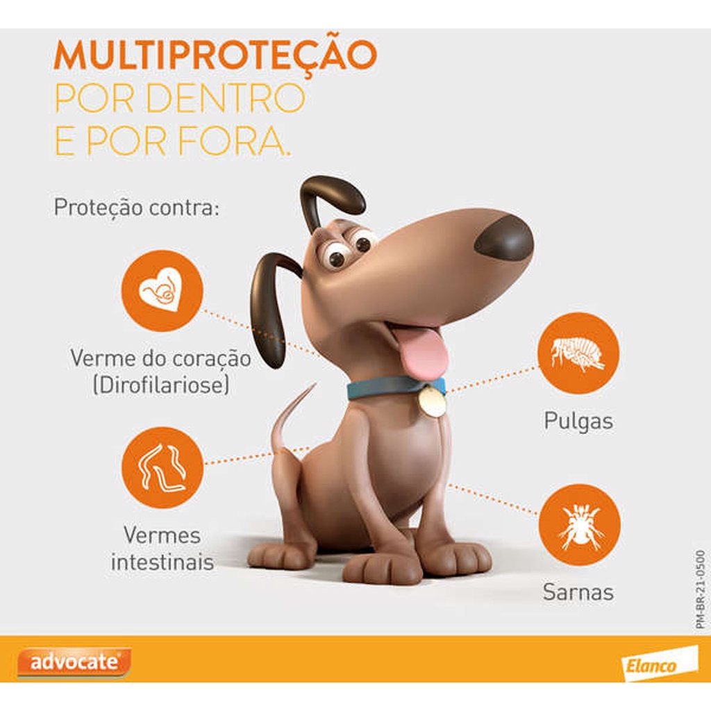 - Aplicação prática; - Previne a Dirofilariose; - Auxilia a desinfestação do ambiente; - Ação imediata sem precisar picar o animal; - Eficaz no tratamento contra pulgas por 4 semanas; - Pode ser aplicado logo após o banho e tosa, com o pelo seco; - Trata e previne os principais vermes intestinais redondos de cães e gatos; - A partir de 7 semanas de vida do cão/ A partir de 9 semanas de vida do gato; - Indicado para o tratamento para o tratamento de sarnas: sarcóptica, demodécica e otodécica. * Consulte sempre o Médico Veterinário de sua confiança para o uso apropriado deste produto. Leia a bula ou informações descritas na embalagem. Detalhes O Antipulgas Elanco Advocate com 1,0 mL é indicado para a prevenção e tratamento das infestações por pulgas, piolhos, ácaros das sarnas otodética, sarcóptica e demodécica e os vermes intestinais em cães de até 4 Kg a 10 Kg de peso. O produto deve ser aplicado de acordo com o peso do cachorro na região da nuca do animal, afastando os pelos. Pode ser aplicado após o banho quando o pelo e a pele do animal estiverem secos. Dicas Especiais O produto pode ser usado em fêmeas em qualquer fase da gestação ou da lactação, em cães jovens (a partir de 7 semanas de idade) e idosos. O produto é de sabor amargo, portanto pode ocorrer salivação se os cães lamberem o local da aplicação, o que não significa um sinal de intoxicação e normalmente desaparece após alguns minutos. Administrar dentro da dose recomendada, não existe alterações da pele, mas alguns cães podem apresentar reações alérgicas cutâneas; em caso de irritação, desconforto ou sensibilidade, o cachorro deve ser banhado, com água morna e sabão neutro em abundância, pelo menos três vezes seguidas para remoção do produto. Venda sob prescrição do médico veterinário. *LEVE SEU CÃO REGULARMENTE AO VETERINÁRIO Composição Cada embalagem contém: - 1 Bisnaga de 1 ml Cada 1 mL da Bisnaga contém: - Imidacloprida: 100 mg - Moxidectina: 25 mg - Veículo q.s.p: 1 mL