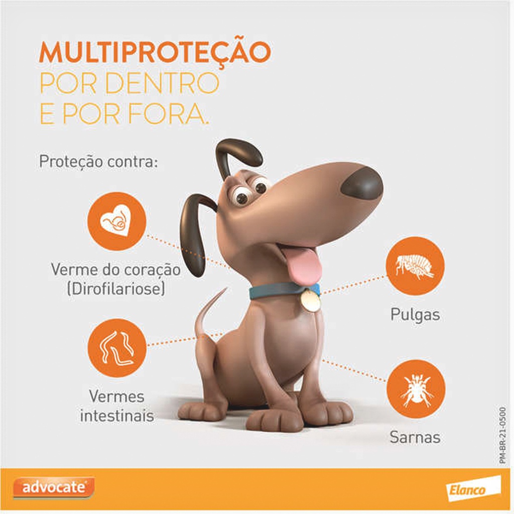 - Auxilia na proteção contra verme do coração (Dirofilariose), pulgas, vermes intestinais e sarnas; - Possui multiproteção ao seu pet, agindo por dentro e por fora; - Com maior duração e mais resistente a água, sendo de fácil aplicação; - Pode ser aplicado logo após o banho e tosa, com o pelo seco; - Dose única mensal, podendo ser usada a partir de 7 semanas de vida do pet. * Consulte sempre o Médico Veterinário de sua confiança para o uso apropriado deste produto. Leia a bula ou informações descritas na embalagem. Detalhes O Antipulgas e Vermicida Advocate para Cães de 10 Kg até 25 Kg (2,5 ml) possui composição exclusiva que combina em uma única dose mensal, tratamento e prevenção contra pulgas, vermes intestinais, verme do coração e sarnas. Tratamento tópico e de fácil aplicação, é rápida e eficiente no controle das pulgas e elimina os vermes adultos no intestino e os estágios jovens dos vermes, que podem migrar para outros órgãos interrompendo assim o ciclo de vida do parasita. Além disso, ele trata e previne as sarnas otodécica, sarcóptica e demodécicas dos cães. Dicas Especiais Antipulgas e Vermicida Advocate para Cães de 10 Kg até 25 Kg (2,5 ml) é seguro para administração em cães a partir de 7 semanas, fêmeas gestantes e lactantes, e em raças sensíveis, como Collies. Composição Cada 1ml da Bisnaga contém Imidacloprida 100 mg, Moxidectina 25 mg, Veículo q.s.p 1ml