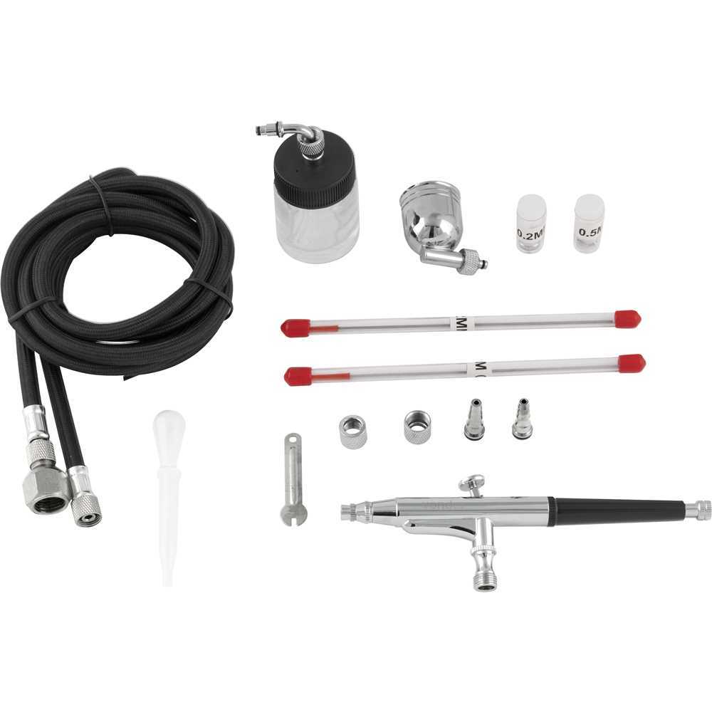 ***PRODUTO A PRONTA ENTREGA COM ENVIO IMEDIATO*** 1 Aerógrafo com 15 acessórios. Acompanha: 3 bicos (0,2 mm, 0,3 mm e 0,5 mm), 3 agulhas (0,2 mm, 0,3 mm e 0,5 mm), 1 copo de metal 7 ml, 1 copo de vidro 22 ml, 1 chave, 1 mangueira 1,8 m, 1 conector 1/8" fêmea com espigão 1/4", 1 tudo de sucção e 2 adaptadores rápidos. Proporciona baixo consumo de ar, com excelente precisão e desempenho. Indicado para trabalhos artesanais e atividades que exijam precisão e qualidade, como: micropinturas, retoques, personalização de veículos, capacetes, tanques de motos, entre outros. Pode também ser utilizado com produtos alimentícios e outros, tais como: culinária, confeitaria, pinturas corporais e maquiagem. Garantia legal: 90 dias + Garantia contratual: 3 meses Manual de Instruções Detalhes Técnicos Material:Cobre Pressão de trabalho do aerógrafo:15 lbf/pol² - 50 lbf/pol² Rosca de entrada de ar do aérografo:1/8" BSP macho Capacidade da caneca:7 ml (metálica) e 22 ml (vidro) Consumo de ar do aerógrafo:0,07 pcm (2 L/min) Tipo de acionamento:Dupla ação Massa aproximada (peso):0,6 kg