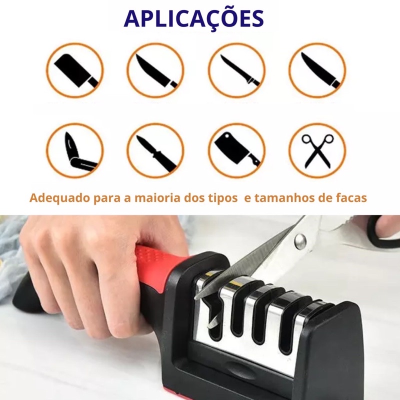 Afiador De Faca 4 Estágios Amolador De Faca Profissional ferramentas Cozinha Em Aço Inoxidável - Afiar - Amolar - Acabamento -Afiar Tesouras Instruções 1 - Coloque o afiador em uma plataforma, com a mão esquerda segure o cabo, e com a mão direita coloque a faca verticalmente na Parte Afiar (n°1), com força apropriada e com a ponta da faca para baixo, puxar sempre para trás (nunca para frente). Repita o processo Várias vezes até que sua faca fique totalmente afiada. 2 - Após o processo acima, coloque a faca no parte (nº2) puxando a faca para trás (como no processo anterior). 3- E para dar acabamento, repita o mesmo processo na parte (nº3). Obs - Para afiar Tesouras, utilize apenas a Parte (nº4). Nota - Verifique a posição ou ângulo da faca antes de Afiar. Características: - Este produto da lojas Acesso é indicado para afiar facas e tesouras de aço inox; - Afia Simultaneamente os dois lados da Faca; - Este produto não deve ser usado para afiar lâminas serrilhadas; - Não necessita água, nem óleo para afiar; - Produto Moderno, simples e fácil de usar; Para um modo de uso seguro e adequado: - Por ser um produto que será associado à facas e tesouras, que são objetos cortantes tenha muito cuidado ao manusear este item; - mantenha fora do alcance de Crianças; ——janeeimport