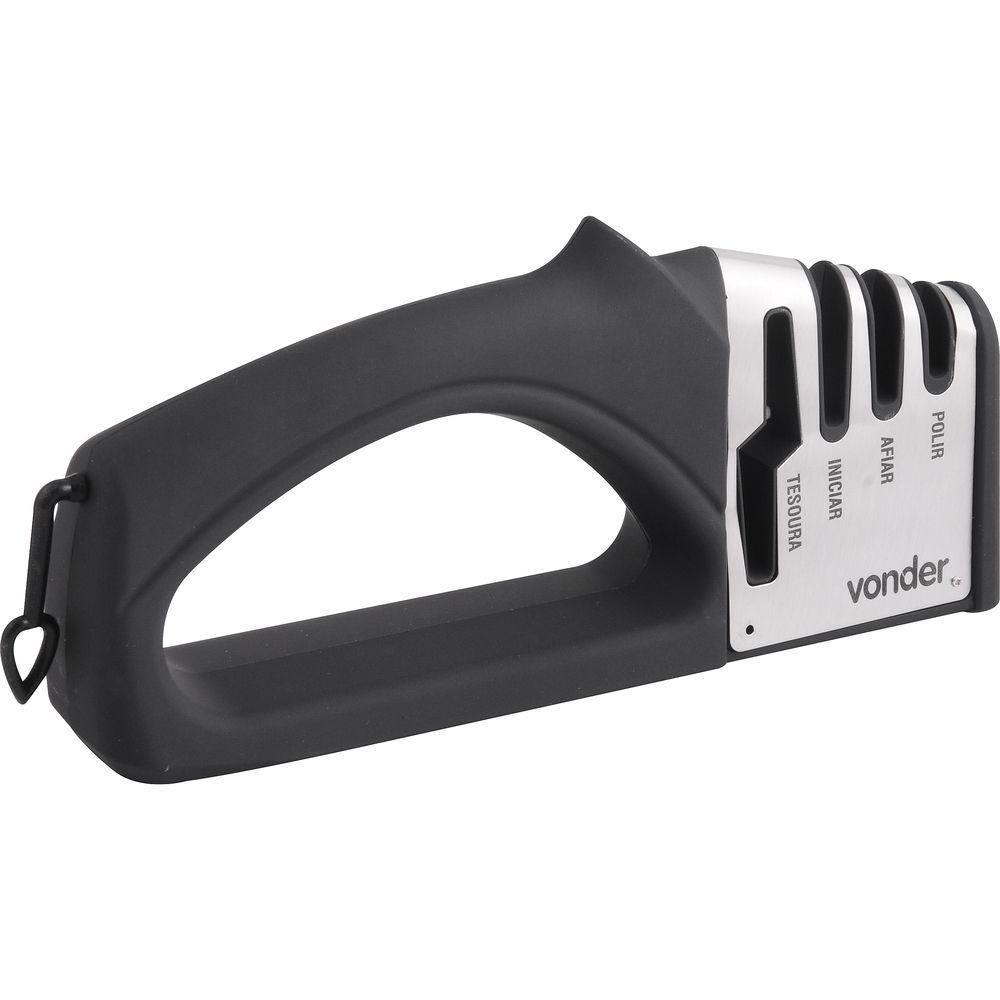 Ref. Fornecedor: 1240100400 Marca: Vonder Destaques e diferenciais: Afiador 2 em 1. Fácil de usar, possui alça estável e segura. Aplicações e dicas de uso: Indicado para afiar facas e tesouras Características Técnicas: Material do corpo do afiador: Cabo plástico Material da superfície de afiação: Cerâmica, tungstênio e diamante Aplicação: Facas e tesouras
