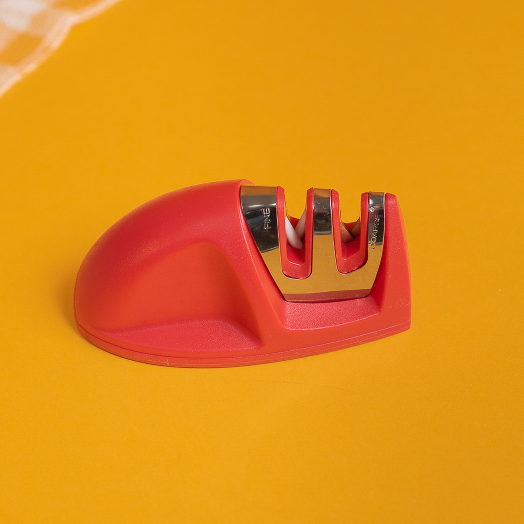 Afiador de facas - Mozcada Esse é o afiador de facas da MOZCADA. Útil: mantenha suas facas sempre afiadas. Pra afiar e polir: primeiro coloque a faca no local de afiar. Faça uma leve pressão e deslize a faca por todo seu comprimento. Não esqueça de fazer o movimento só em uma direção, sempre da base para a ponta. Repita o processo no local de polir e pronto! Livre de BPA: não libera substâncias tóxicas na comida.
