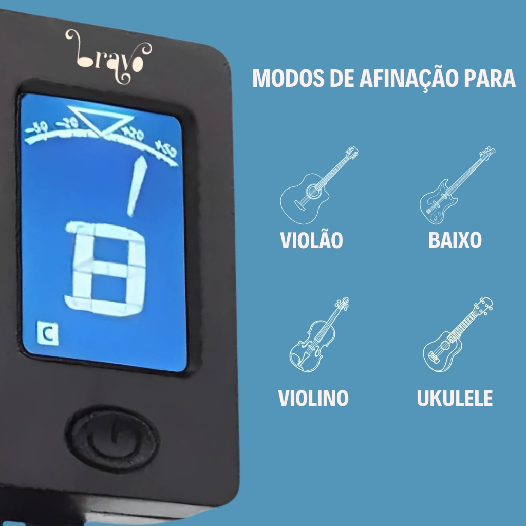 O Afinador Digital BT02 da Bravo é compacto, prático e ideal para músicos. Com display LCD de fácil leitura e rotação de 360 graus, é perfeito para afinar uma ampla variedade de instrumentos de corda, como violão, guitarra, ukulele, contrabaixo e violino. Portátil e preciso, pode ser levado a qualquer lugar. Afine seu instrumento com rapidez e precisão, onde quer que esteja! Especificações: Afinador digital cromático; Rotação de 360 graus; Display de LCD; Opções de afinação: C (Cromático), G (violão/guitarra), B (contra-baixo), V (violino) e U (ukulele) Flat: b, bb; Chave: C, F, Bb, Eb; Frequência: A0 (275MHz) - C8 (4186Hz); Alimentação: Bateria CR2032; Tamanho: 89,00 x 53,00 x 18,50mm. Produto 100% original com garantia em todo território nacional