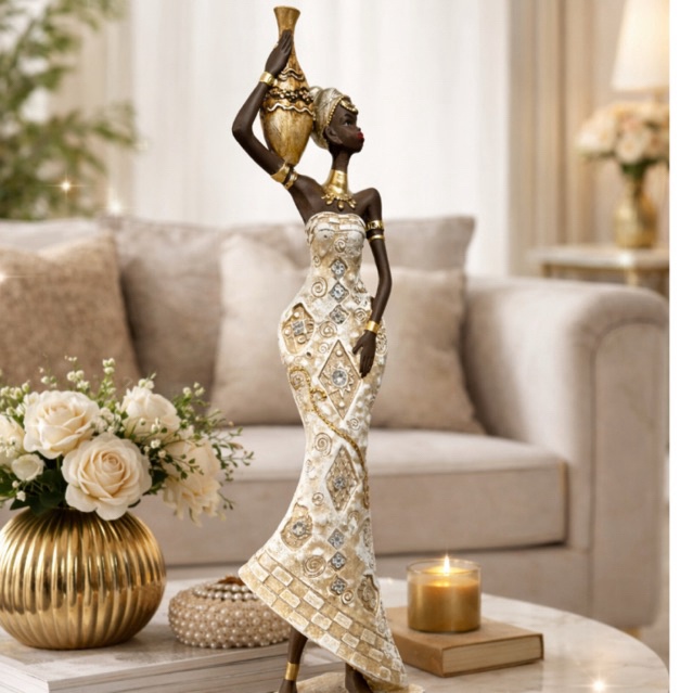 Escultura decorativa feminina africana, perfeita para valorizar a decoração da sua casa, sala ou escritório. Peça cheia de elegância e cultura, com detalhes delicados em dourado e acabamento sofisticado. Ideal para colocar em racks, aparadores, mesas ou estantes, trazendo um toque artístico e moderno ao ambiente. Características: Material: Cerâmica (ou resina, conforme o produto) Altura aproximada: 44cm Cor: Tons de marrom, dourado e bege Acabamento detalhado com textura e brilho Estilo: Africano, Étnico, Artesanal Uso: Decoração de interiores, presente, coleção