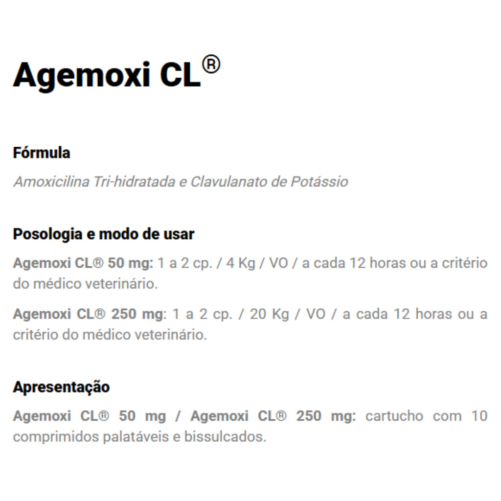 Agemoxi CL 250mg Cães e Gatos 10 Comprimidos – Agener União *PRODUTO ORIGINAL Antimicrobiano para cães e gatos à base de amoxicilina e ácido clavulânico (clavulanato de potássio). Possui 2 apresentações: · Agemoxi® CL 250 mg, comprimido (10 un de comprimido, tamanho do comprimido 15 mm x 15 mm) · Agemoxi® CL 50 mg, comprimido (10 un de comprimido, tamanho do comprimido 9 mm x 9 mm) Comprimidos bissulcados e palatáveis (pode ser partido com segurança em até 4 partes) Tem ação contra bactérias Gram-positivas e Gram-negativas é indicado para: Cães: tratamento das infecções causadas por cepas sensíveis de Enterococcus faecalis, Enterococcus faecium, Fusobacterium nucleatum, Porphyromonas gulae, Staphylococcus aureus, Staphylococcus epidermidis, Staphylococcus intermedius, Streptococcus canis, Streptococcus pyogenes e Truperella pyogenes. Gatos: tratamento das infecções causadas por cepas sensíveis de Enterococcus faecalis, Enterococcus faecium, Staphylococcus aureus, Staphylococcus epidermidis, Streptococcus pyogenes e Truperella pyogenes. Modo de usar: · 1 comprimido de 50 mg para cada 4 kg de peso a cada 12 horas ou a critério do médico veterinário · 1 comprimido de 250 mg para cada 20 kg de peso a cada 12 horas ou a critério do médico veterinário Qualquer dúvida, ficaremos felizes em responder! Obs: por se tratar de medicamento, recomendamos que procure um (a) médico veterinário **CUIDADO COM PRODUTOS FALSOS, SOMOS REVENDEDORES AUTORIZADOS E NOSSOS FORNECEDORES SÃO CREDENCIADOS**