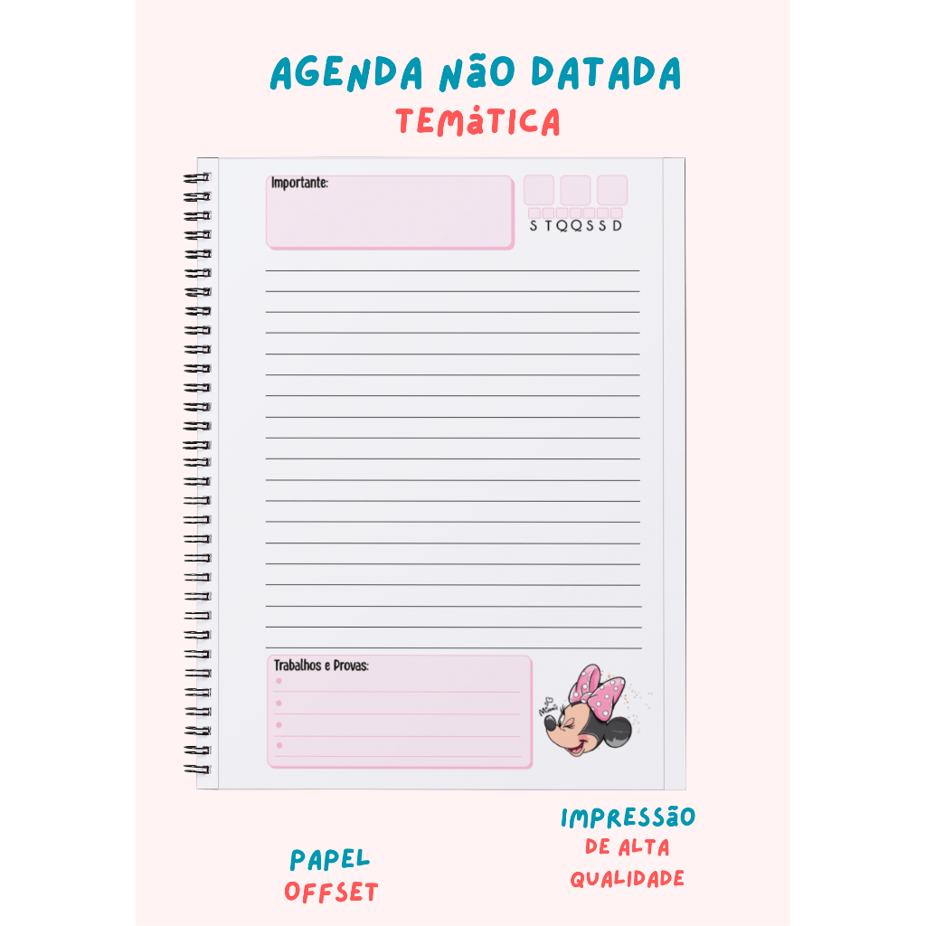 Agenda 2026 - A5 - com nome na capa. Escolar/ Maternal/ Berçario/ Creche - com elástico e bottons - Minnie #017