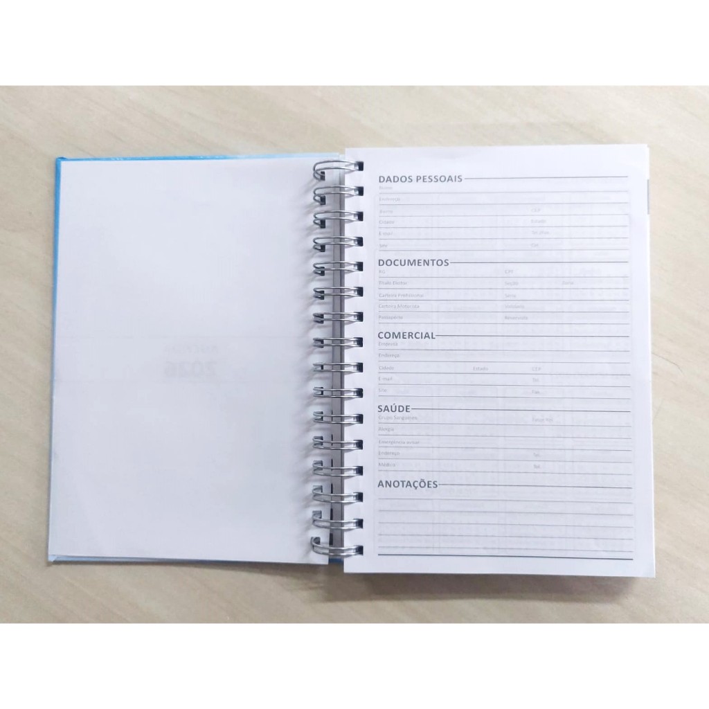 Descrição: Capa Dura com Laminação brilho; Wire-o; Miolo: 15x21cm 396 páginas em papel offset 63g - 1x1 cores (CINZA), sendo: - 1 dia por página inclusive SÁBADOS e DOMINGOS; - Dados pessoais, Documentos, Comercial, Saúde, Calendário 2025 e 2027, - Calendário 2026, Planejamento 2026, Endereços e Telefones e Anotações;
