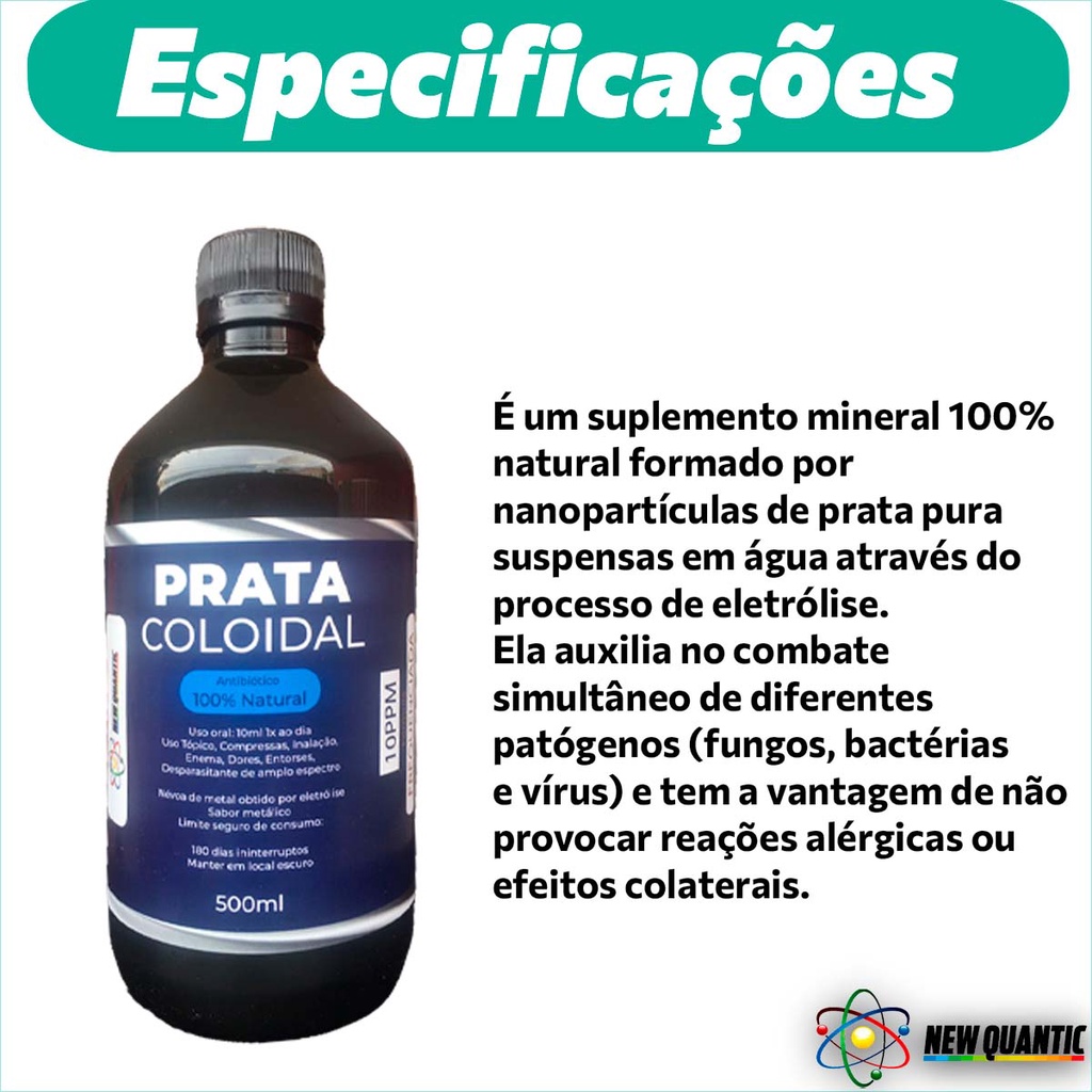 PRATA COLOIDAL 500ML A Prata Coloidal New Quantic é um suplemento mineral 100% natural que auxilia no combate simultâneo de diferentes patógenos (fungos, bactérias e vírus) e tem a vantagem de não provocar reações alérgicas ou efeitos colaterais. É eficiente em mais 650 tipos de problemas. Muito difundido no exterior, o uso da prata pode auxiliar com eficiência na defesa do organismo, na prevenção e no combate a doenças.A Prata Coloidal desenvolvida pela New Quantic possui 10PPM (REAL), é produzida com compostos naturais, água de osmose reversa e frequenciada com padrões quânticos com base na Dra.Hulda Clakc e RIFE.Dosagem diária recomendada:-Uso oral preventivo: copinho dosador (10 ml) 1 vez ao dia ou pode ser divido em 4 copinhos de 2,5 ml.-Uso oral casos agudos: (20 ml) 4 vezes ao dia (usar no máximo 60 dias). E dar um intervalo de 15 dias. -Uso tópico (spray): Aplicar diretamente nas áreas afetadas até 3 vezes ao dia.-Uso recomendado de 60 dias seguidos e pausa por 30 dias.Observações: -Produto natural e sem contraindicações.-Não colocar na geladeira.-Não armazenar próximo aos aparelhos eletrônicos e eletrodomésticos.-Validade por 6 meses, mantendo em local escuro.-Não substitui qualquer tratamento prescrito pelo seu médico. -Os efeitos e benefícios certamente variam de uma pessoa para outra considerando as estruturas: biotipo e metabolismo específico. -Consulte o seu médico regularmente.Isento de registro na Anvisa - RDC 240 de 26/07/2018.Qualquer dúvida estamos à disposição.