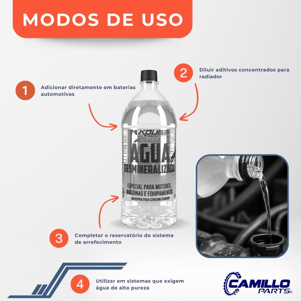 Bem vindo!! Você está em uma loja especializada em soluções automotivas seguras e confiáveis. Aqui, cada detalhe é pensado para cuidar do que move você: sua família, sua segurança e seus melhores momentos na estrada. 💧 ÁGUA DESMINERALIZADA PARA RADIADOR E BATERIA KOUBE – 1 LITRO A Água Desmineralizada Premium Koube é isenta de sais minerais, íons e impurezas. Produzida por um processo rigoroso de purificação, resulta em um produto com alto grau de pureza e baixíssima condutividade elétrica, ideal para sistemas automotivos. 📦 CONTEÚDO DA EMBALAGEM 1 unidade de Água Desmineralizada Koube 1 Litro Código: 31760 🏷️ MARCA Koube Químicos 🔢 CÓDIGO DA PEÇA 31760 / 00.001 ⚙️ ESPECIFICAÇÕES TÉCNICAS Tipo: Água desmineralizada para radiador e bateria Condição: Novo Aparência: Líquido límpido Cor: Incolor Condutividade elétrica: Baixa 🌟 CARACTERÍSTICAS ✅ Isento de minerais naturais e íons ✅ Alto grau de pureza ✅ Baixa condutividade ✅ Uso indicado em baterias e limpadores de para-brisa 🚗 APLICAÇÕES Pode ser utilizada em: 🔧 Radiadores 🔋 Baterias 🚿 Limpadores de para-brisa 📘 MODO DE USAR ➤ Para aditivos concentrados: diluir conforme recomendação do fabricante. ➤ Para baterias e limpadores: adicionar diretamente no reservatório. ⚠️ Não ingerir – produto impróprio para consumo humano. 📝 INFORMAÇÕES ADICIONAIS 📦 Produtos com envio imediato 🆕 Todos os produtos são novos, com garantia e nota fiscal 🛒 Utilize o carrinho de compras e economize no frete 🔄 Devolução somente com embalagem original e nota fiscal 🏬 Grupo Camillo – Loja física com mais de 40 anos de tradição 🛡️ GARANTIA 🕒 90 dias de garantia 🔧 Não cobre mão de obra 🛠️ Recomendado uso de oficinas especializadas ⚠️ Não nos responsabilizamos por instalação inadequada ou mau uso 🧾 Certificado preenchido é indispensável para qualquer procedimento de garantia ❓ DÚVIDAS? Antes de comprar, esclareça todas as dúvidas para garantir a compra correta. ⚠️ ATENÇÃO - DIREITOS AUTORAIS 🚫 Proibida a cópia ou uso das imagens e conteúdos dos anúncios. 📜 Protegidos pela Lei 9.610/98 – Direitos Autorais. Qualquer infração será tratada judicialmente.