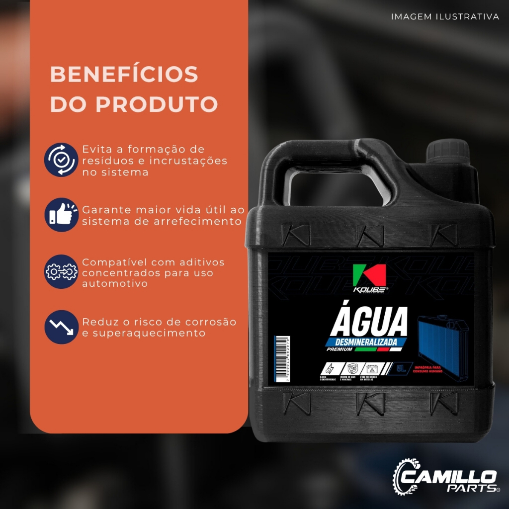 PRODUTO NOVO Quer garantir proteção e eficiência no sistema de arrefecimento e baterias do seu veículo? Características do Produto – Marca: Koube – Volume: 5 L – Tipo de Produto: Água Desmineralizada – Uso Recomendado: Baterias automotivas e sistemas de arrefecimento – Condutividade Elétrica: Inferior a 5 µS – Composição: Água purificada sem minerais e íons naturais – Origem: Brasil Por que escolher este produto – Altamente purificada, reduz riscos de corrosão – Mantém desempenho ideal de baterias e radiadores – Compatível com aditivos concentrados Koube – Garante longa vida útil do sistema de arrefecimento Dicas de Uso – Dilua 50% de água desmineralizada Koube para 50% de aditivo concentrado Koube – Adicione a mistura no reservatório de expansão do sistema de arrefecimento – Utilize sempre água desmineralizada para evitar depósitos minerais Perguntas Frequentes – Esta água pode ser usada pura em baterias? Sim, é indicada para baterias automotivas, preferencialmente junto ao eletrólito recomendado. – Pode ser misturada com qualquer aditivo? Deve ser usada com aditivos Koube para garantir a solução correta para radiadores. – Qual a vantagem de usar água desmineralizada? Evita corrosão e depósitos minerais, mantendo o sistema limpo e eficiente. Água Desmineralizada Koube 5 L — protege e mantém o desempenho de radiadores e baterias automotivas.