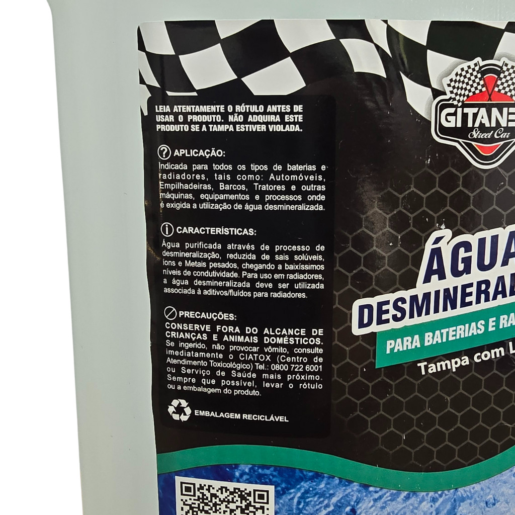 Água Desmineralizada Gitane A Água Desmineralizada Gitane é especialmente indicada para uso em baterias automotivas e estacionárias, radiadores e sistemas de arrefecimento de veículos leves, pesados e industriais. Também pode ser utilizada em tratores, barcos, empilhadeiras, máquinas e equipamentos que exigem água pura e livre de minerais. ? Processo de Purificação Produzida através de um avançado processo de desmineralização, a água passa por etapas que reduzem os sais solúveis, íons e metais pesados, alcançando baixíssimos níveis de condutividade elétrica. Isso garante maior proteção contra corrosão e incrustações. ? Benefícios e Características Livre de sais minerais, íons e metais pesados Baixíssima condutividade elétrica (água mais pura e segura) Evita corrosão, incrustações e superaquecimento Aumenta a vida útil de baterias, radiadores e componentes internos Uso automotivo, náutico, agrícola e industrial ? Indicações de Uso Baterias de automóveis, caminhões, ônibus, tratores e empilhadeiras Radiadores de veículos leves e pesados Sistemas de arrefecimento de barcos e máquinas industriais Equipamentos e processos que exijam água desmineralizada ⚠️ Importante: Para uso em radiadores, a Água Desmineralizada Gitane deve ser utilizada em conjunto com aditivos ou fluidos específicos de arrefecimento. ? Precauções Mantenha fora do alcance de crianças e animais domésticos Produto não indicado para consumo humano Em caso de ingestão, não provoque vômito e procure imediatamente o serviço de saúde mais próximo ou o CEATOX (0800-148110) levando o rótulo ou a embalagem do produto Embalagem 100% reciclável