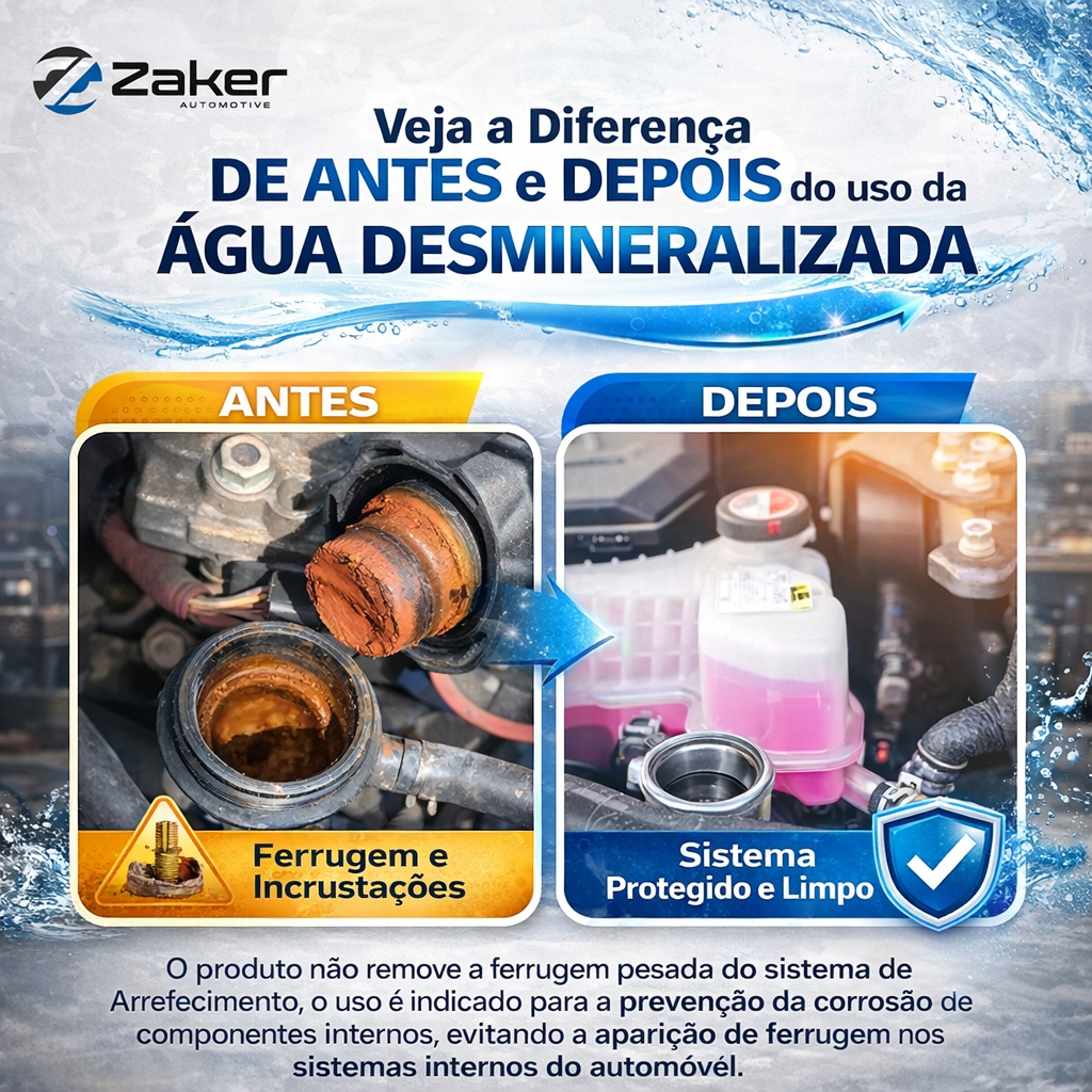 Água Desmineralizada Para Radiador E Bateria Automotiva Zaker A água desmineralizada Zaker é indicada para uso em sistemas de arrefecimento, sistemas elétricos automotivos, autoclaves, laboratórios e outras aplicações que exigem alto grau de pureza. Produzida com tecnologia avançada, passa por pré-filtragem, carvão ativado e osmose reversa, removendo minerais e impurezas como cloro, cálcio, magnésio, ferro e sódio. Com condutividade elétrica máxima de 10 µS/cm, garante excelente desempenho, proteção e maior durabilidade dos sistemas. -Serve para todos os veículos (carros, motos, utilitários e caminhões) -Compatível com qualquer marca ou modelo. -Pode ser utilizada em sistemas de arrefecimento e limpeza. COMO USAR: Pode ser utilizada pura, diretamente em: Limpador de para-brisa Baterias Para radiadores: Utilizar conforme recomendação do fabricante do aditivo Ideal para diluição de aditivos concentrados IMPORTANTE O uso de água comum pode causar: Ferrugem no sistema Entupimento do radiador Superaquecimento do motor Redução da vida útil do veículo Por isso, o uso de água desmineralizada é essencial para manter o bom funcionamento! Ideal para uso em baterias automotivas e sistemas de arrefecimento automotivo, em combinação com aditivos para formar a solução arrefecedora. INSTRUÇÕES DE USO: Diluir 50% de Água Desmineralizada com 50% de Aditivo Concentrado e adicionar ao reservatório de expansão do sistema de arrefecimento. Embalagem: 1L OU 5L