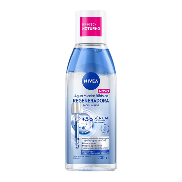 NIVEA Água Micelar Bifásica Regeneradora 200ml, Limpeza Suave, Pele Regenerada, Aparência Descansada O que é? NIVEA Água Micelar Bifásica Regeneradora é um cuidado facial que combina 5% de sérum com p