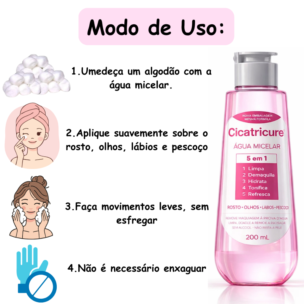 Água Micelar Cicatricure 200ml - Limpeza Profunda e Hidratação QUAL A FUNÇÃO DESSE PRODUTO? - A Água Micelar Cicatricure é um produto revolucionário desenvolvido para proporcionar uma limpeza facial profunda e eficaz, removendo impurezas, maquiagem e oleosidade da pele sem agredi-la. BENEFÍCIOS - Limpeza suave e eficaz - Remove impurezas e maquiagem - Hidratação profunda - Não necessita de enxágue - Adequado para todos os tipos de pele, inclusive sensíveis DIFERENCIAIS - Fórmula suave e dermatologicamente testada - Tecnologia micelar avançada - Enriquecida com ingredientes hidratantes - Fragrância suave e agradável MODO DE USO - Aplique a Água Micelar Cicatricure em um algodão e passe suavemente sobre o rosto, olhos e lábios. Não é necessário enxaguar. INGREDIENTES EM DESTAQUE - Micelas de limpeza - Glicerina hidratante EM QUANTO TEMPO DE USO EU VEJO OS RESULTADOS? - Os resultados podem variar de pessoa para pessoa, mas muitos usuários relatam uma melhora na textura e na luminosidade da pele após poucos dias de uso regular. ELE DEIXA A PELE OLEOSA? - Não, a Água Micelar Cicatricure possui uma fórmula leve e não oleosa, deixando a pele limpa e fresca. ELE IRRITA A PELE? - Sua fórmula suave e dermatologicamente testada minimiza o risco de irritação, tornando-o adequado para peles sensíveis. A PARTIR DE QUANTOS ANOS PODE DE COMEÇAR A USAR? - Pode ser utilizado por adultos de todas as idades e adolescentes a partir de 13 anos ELE É TESTADO DERMATOLOGICAMENTE? - Sim, a Água Micelar Cicatricure passou por rigorosos testes dermatológicos para garantir sua eficácia e segurança. QUAL O MELHOR HORÁRIO PARA SE USAR? - Pode ser usado tanto de manhã quanto à noite, como parte da rotina diária de cuidados com a pele. QUAIS REGIÕES DO CORPO SE USA ELE? - É indicado para uso no rosto, incluindo área dos olhos e lábios. QUAL A FRAGÂNCIA DELE? - Possui uma fragrância suave e refrescante. QUAL A TEXTURA DO PRODUTO? - A Água Micelar Cicatricure possui uma textura leve e fluida, que é rapidamente absorvida pela pele. OUTRAS INFORMAÇÕES RELEVANTES Produto não comedogênico Livre de parabenos e corantes Produto não testado em animais Embalagem econômica de 200ml, ideal para uso diário. Adquira agora a Água Micelar Cicatricure de 200ml e experimente a diferença em sua rotina de cuidados com a pele! PALAVRAS E TERMOS CHAVE - Água micelar, limpeza facial, hidratação, remoção de maquiagem, pele sensível, fórmula suave, dermatologicamente testado. Água Micelar Cicatricure, Limpeza Facial, Micelas, Remoção de Maquiagem, Pele Sensível, Não Oleosa, Hipoalergênica, Dermatologicamente Testada, Rotina de Cuidados com a Pele, agua micelar cicatricure, cicatricure agua micelar, água micelar cicatricure, agua micelar cicatricure resenha, água micelar cicatricure tira manchas, cicatricure água micelar, agua micelar cicatricure é boa, água micelar da cicatricure, agua micelar cicatricure 200ml, água micelar cicatricure para espinhas, cicatricure água micelar 200ml