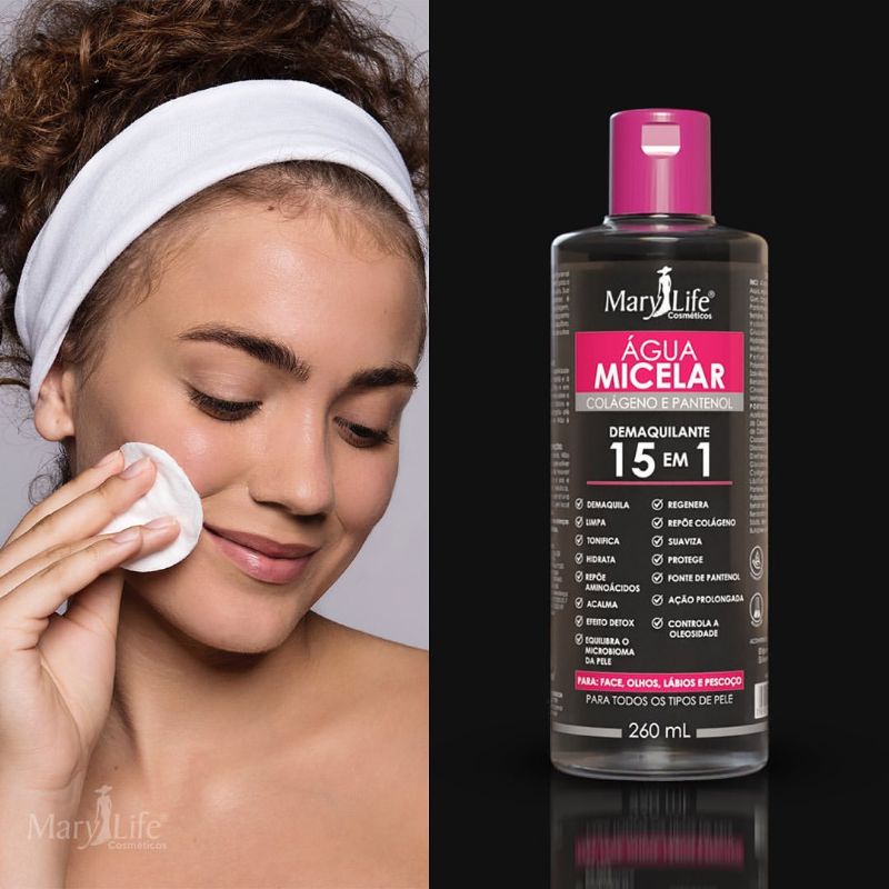 Água Micelar Colágeno e Pantenol - 260mL - Mary Life (Demaquilante 15 em 1) A Água Micelar Colágeno e Pantenol Mary Life é a fórmula perfeita para o cuidado diário da pele do rosto. Sua composição suave e poderosa é capaz de remover maquiagem, poluição e oleosidade enquanto repõe colágeno, pantenol, equilibra, hidrata e promove dezenas de outros benefícios. • 1 Demaquila • 2 Limpa • 3 Tonifica • 4 Repõe Aminoácidos • 5 Hidrata • 6 Acalma • 7 Protege • 8 Repõe Colágeno • 9 Efeito Detox • 10 Controla a Oleosidade • 11 Equilibra o Microbioma da Pele • 12 Regenera • 13 Suaviza • 14 Fonte de Pantenol • 15 Ação Prolongada INFORMAÇÕES: A Água Micelar Colágeno e Pantenol Mary Life é a fórmula perfeita para o cuidado diário da pele do rosto. Sua composição suave e poderosa é capaz de remover maquiagem, poluição e oleosidade enquanto repõe colágeno, pantenol, equilibra, hidrata e promove dezenas de outros benefícios. MODO DE USO Aplicar uma pequena quantidade de Água Micelar, de manhã e à noite, sobre um algodão e em seguida passar suavemente sobre a pele da face, olhos, lábios e pescoço. Repetir a aplicação até limpeza total da pele. Não é necessário enxágue.