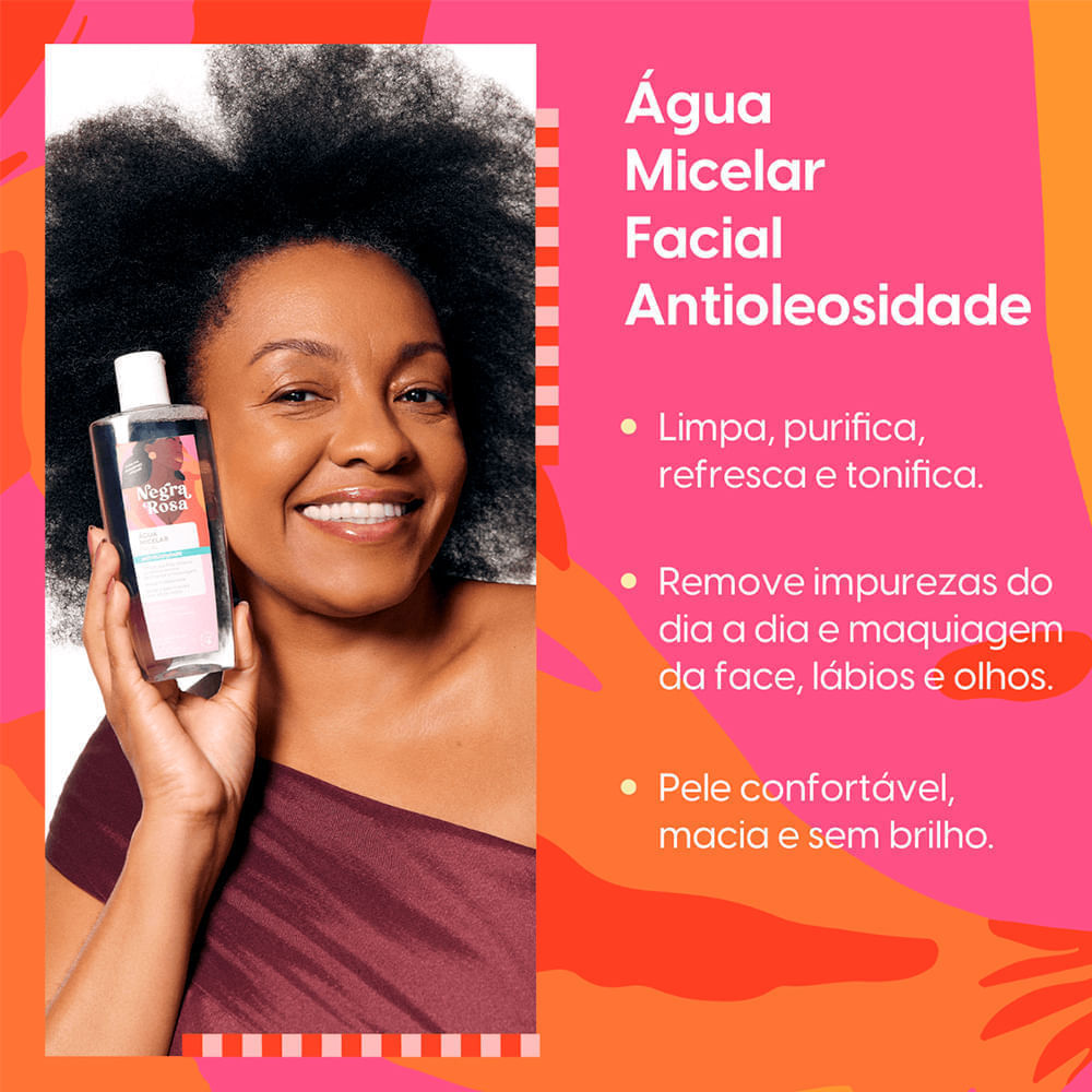 A Água Micelar Negra Rosa Antioleosidade 200ml é a solução de limpeza completa para a sua rotina diária de cuidados da pele. Elimina com facilidade impurezas do dia-a-dia, maquiagem e oleosidade, deixando a pele limpa, fresca, tonificada e com aspecto mate. Sua fórmula livre de parabenos não deixa resíduos e respeita o equilíbrio fisiológico, trazendo uma sensação de conforto. É muito fácil de usar, todos os tipos de pele vão adorar. Além disso, segundo estudos clínicos em peles negras 89% pele mais limpa, 86% ação purificante e 89% remoção da oleosidade. Benefícios: - Limpa, purifica, refresca e tonifica; - Hidratação profunda; - Reduz a oleosidade; - Renovação celular. Modo de usar: Aplique com um algodão de limpeza no dia a dia, antes da maquiagem e para retira-la. Sobre a marca: Comecei como blogueira e youtuber há 6 anos, para mostrar que nós mulheres negras podemos usar tudo, não precisamos ficar presas a regras para nosso tom de pele. O ato de compartilhar as minhas descobertas incentivou outras mulheres negras a descobrir suas belezas únicas. Desde então percebi que não haviam muitos produtos voltados para a mulher negra. Então decidi criar uma linha pensando exclusivamente nos nossos vários tons de pele. Os produtos tem o meu olhar, o olhar de uma mulher negra para outra mulher negra, um conceito todo especial para realçar a nossa beleza.
