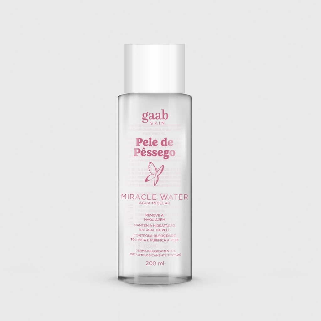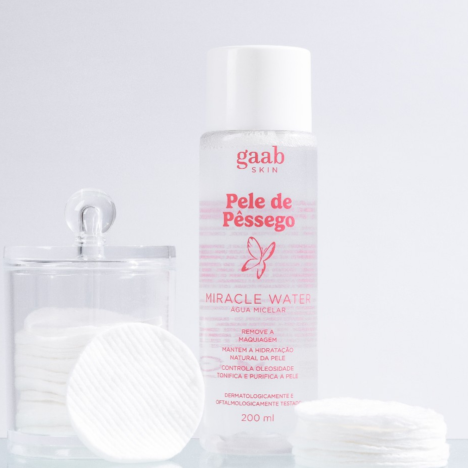 A Água Micelar Miracle Water de Gaab Skin é um produto que proporciona hidratação e limpeza profunda para sua pele, sem causar danos ou ressecamento. Ela é indicada para todos os tipos de pele, inclusive as mais sensíveis. ✅ Remove as impurezas e a maquiagem sem ressecar ou irritar a pele; ✅ Equilibra o pH da pele e ajuda a controlar a oleosidade; ✅ Hidrata e acalma a pele, deixando-a macia e luminosa; ✅ Previne o envelhecimento precoce e protege a pele dos radicais livres; ✅ Refresca e tonifica a pele, dando uma sensação de frescor e leveza. A Água Micelar Pele de Pêssego contém ácido hialurônico, um poderoso ativo que hidrata, preenche e previne o envelhecimento precoce da pele. Ele também ajuda a reter a umidade natural da pele, mantendo-a hidratada por mais tempo.