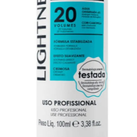 Água Oxigenada Lightner 20 Vol 100 ml: loção cremosa enriquecida com camomila, que acalma e protege os fios. Ideal para descoloração até 2 tons e preparo de tinturas. Textura homogênea que facilita aplicação e proporciona clareamento suave e uniforme.