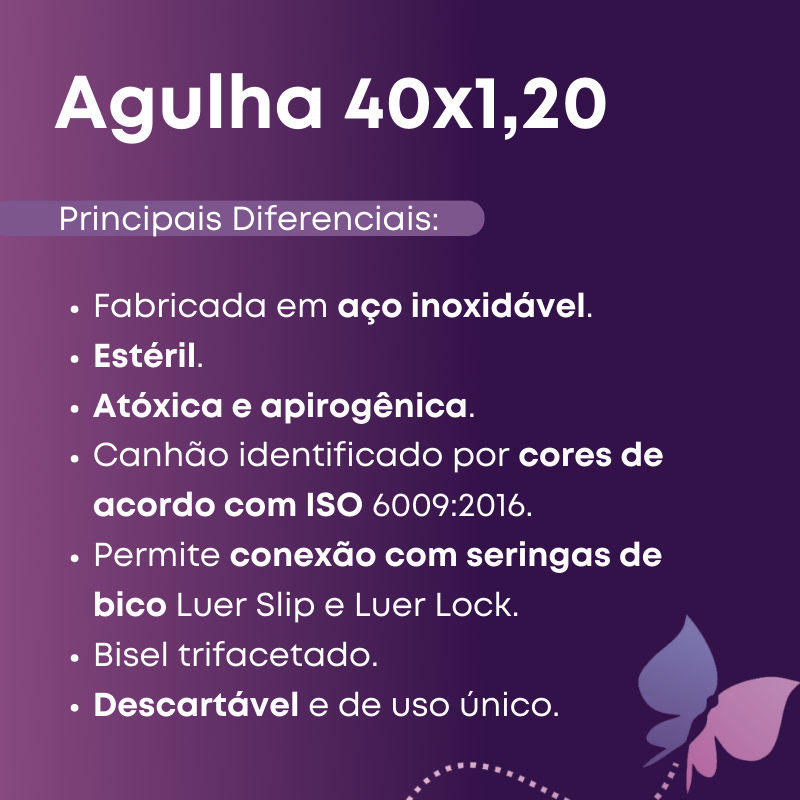 Agulha Hipodérmica Descartável 18G 1 1/2 40x1,20mm - Descarpack As agulhas hipodérmicas descartáveis 18G 1 1/2 40x1,20mm da marca DESCARPACK são desenvolvidas para a aplicação de soluções e medicamentos em diversas vias de administração, incluindo endovenosa, intramuscular, intradérmica e subcutânea. BENEFÍCIOS: - Estéril: Garantia de segurança e higiene para o paciente. - Fabricada em Aço Inoxidável: Material resistente e de alta qualidade. - Canhão com Código de Cores Universal: Facilita a identificação do tamanho e calibre da agulha. - Compatível com Seringas Bico Luer Slip e Luer Lock: Versatilidade no uso. - Bisel Trifacetado: Proporciona uma penetração suave e menos dolorosa. - Lubrificada: Reduz o atrito durante a aplicação. - Atóxica e Apirogênica: Não causa reações tóxicas ou febris. - Descartável e de Uso Único: Previne contaminações e infecções. CARATERÍSTICAS TÉCNICAS: - Marca: DESCARPACK - Tamanho: 40 x 1,20mm (18G 1 1/2) - Registro ANVISA: 10330669063 ITENS INCLUSOS: 100 Unidades - Agulha Hipodérmica Descartável 40 x 1,20mm - Descarpack