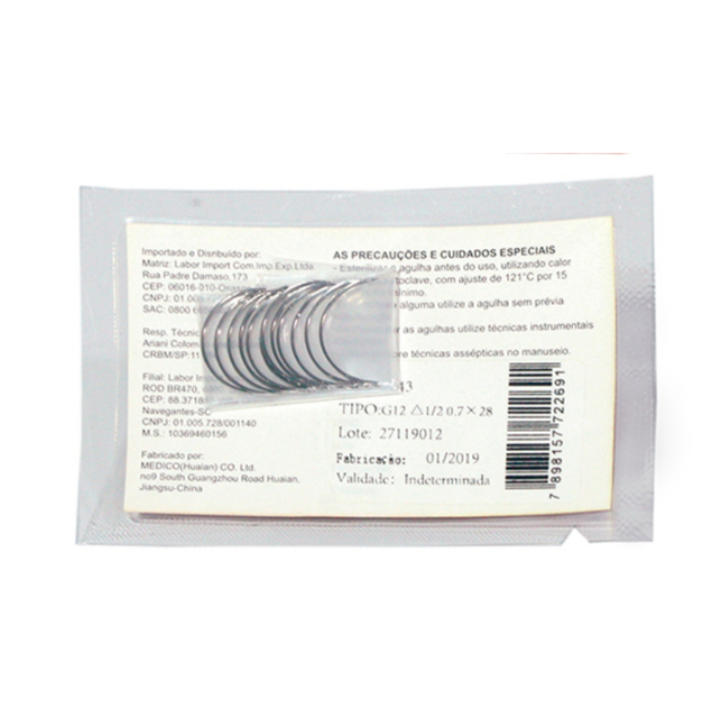 Agulha cirúrgica cilíndrica GR indicada para procedimentos de sutura por profissional habilitado. Produto não estéril, destinado ao uso conforme protocolo técnico. Características Modelo: GR (Cilíndrica) Curvatura: 1/2 Fabricada em liga de aço inoxidável Niquelação galvânica Superfície lisa Produto não estéril Proibido reprocessar Descartar em coletor para perfurocortantes Registro ANVISA: 10237580013 Validade indeterminada Apresentação Embalagem com 12 unidades Tamanhos disponíveis conforme seleção Envio imediato Acompanha Nota Fiscal Produto original