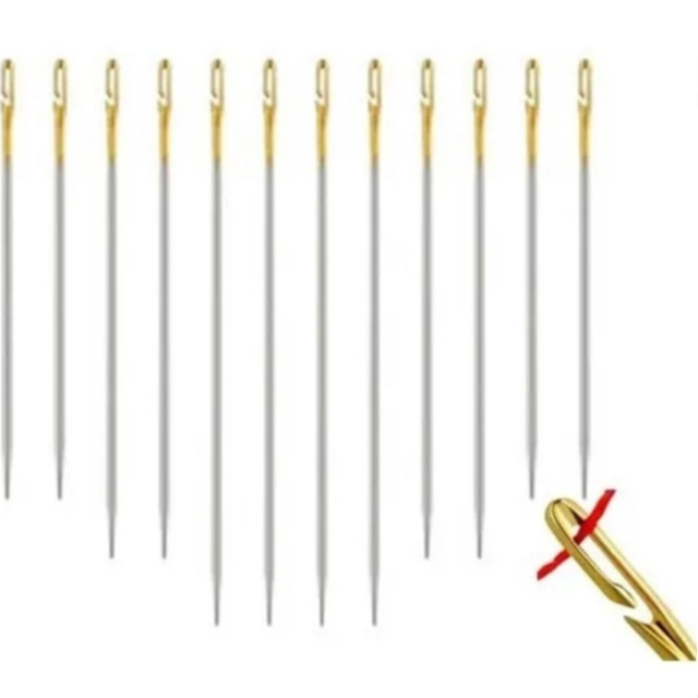 kit de agulha de costura com sistema fácil de passar a linha , ideal para pessoas com deficiência visual ou cegos . Contém 12 agulhas de tamanhos diferentes , variando de 36mm a 42mm. Composição: AÇO INOXIDÁVEL PRATA/ DOURADA Validade: Indeterminado Unidade de Venda: CARTELA COM 12 agulhas