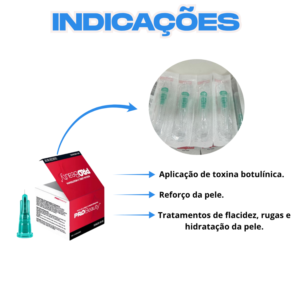 Agulha Lebel e Mesoterapia - Pro Beauty Descrição: As Agulhas Lebel Pro Beauty foram projetadas especialmente para tratamentos intradérmicos, como aplicação de toxina botulínica, skinbooster e procedimentos estéticos voltados para flacidez, rugas e hidratação da pele. Sua construção em liga metálica e bisel trifacetado garante múltiplas injeções com benefícios, minimizando danos teciduais e comodidade maior conforto ao paciente. Características: Bisel Trifacetado: Injeção suave com menor dano tecidual e menos dor para o paciente. Liga Metálica Rígida: Permite múltiplas aplicações sem perder o fio da agulha. Compatibilidade Universal: Adequada para todos os tipos de seringas. Fluxo Rápido: Diâmetro interno projetado para rápida passagem de matéria. Produto Seguro: Estéril, embalado individualmente em papel de grau cirúrgico e esterilizado por Óxido de Etileno. Benefícios: Conforto do Paciente: Menor sensação de dor devido às precauções do bisel trifacetado. Eficiência nos Tratamentos: Ideal para procedimentos estéticos intradérmicos, promovendo regeneração ampliada. Segurança: Uso único, com certificação INMETRO e registro ANVISA, garantindo qualidade e confiabilidade. Praticidade: Embalagem individual, pronta para uso. Indicações: Aplicação de toxina botulínica. Reforço da pele. Tratamentos de flacidez, rugas e hidratação da pele. Recomendações de Uso: Utilização exclusiva para profissionais habilitados e capacitados. Produto de uso único, necessariamente após aplicação. Especificações Técnicas: Marca: Pro Beauty Modelo:Agulha Lebel e Mesoterapia Tamanho: 32G x 0,23mm x 4mm Cor do Canhão: Verde Referência:7448 Material: Liga metálica metálica com acabamento atraumático. Bisel: Trifacetado para melhorias e precisão. Registro ANVISA: 10369469033. Itens Inclusos na Embalagem: 1 Kit com 10 Agulhas Lebel e Mesoterapia 32G x 0,23mm x 4mm - Pro Beauty A Agulha Lebel Pro Beauty é a escolha ideal para profissionais que buscam segurança, precisão e eficiência em tratamentos estéticos intradérmicos, garantindo melhores resultados e conforto ao paciente. Dúvidas Frequentes: P: O que são as Agulhas Lebel e Mesoterapia da Pro Beauty? R: As Agulhas Lebel e Mesoterapia Pro Beauty são ferramentas de alta precisão, fornecidas para tratamentos estéticos, como aplicação de ativos em camadas superficiais e profundas da pele, garantindo eficiência e segurança. P: Quais são os benefícios dessas agulhas? R: Essas agulhas oferecem excelente isolamento, minimizam desconforto durante a aplicação, possuem alta resistência e acabamento de qualidade, ideal para resultados profissionais. P: Para quais procedimentos estéticos elas são indicadas? R: São indicadas para técnicas de mesoterapia, microinfusão de ativos, preenchimentos e outros tratamentos estéticos que desabilitam agulhas de alta performance. P: Essas agulhas são descartáveis? R: Sim, as Agulhas Lebel e Mesoterapia Pro Beauty são descartáveis e de uso único, garantindo máxima segurança e evitando riscos de contaminação cruzada. P: Qual é o diferencial dessas agulhas em relação a outras marcas? R: Elas possuem ponta ultrafina que reduz a dor e o trauma na pele, além de um design otimizado para melhores especificações e soluções durante os procedimentos estéticos. P: Elas são compatíveis com quais equipamentos? R: As agulhas possuem padrão universal, sendo compatíveis com a maioria dos dispositivos para mesoterapia e seringas disponíveis no mercado. P: Como elas são embaladas? R: As Agulhas Lebel e Mesoterapia Pro Beauty são embaladas individualmente em invólucros estéreis, garantindo praticidade e segurança durante o uso.