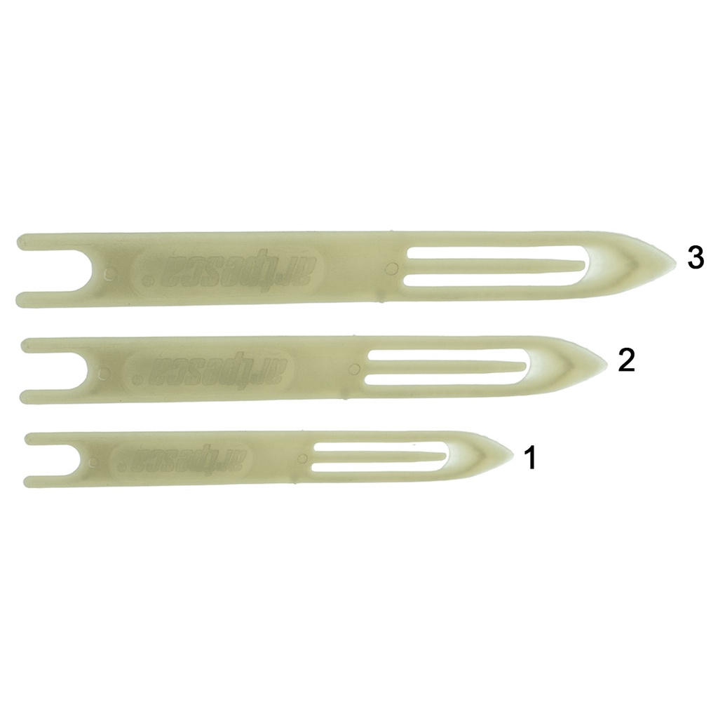 AGULHA PARA ENTALHAR/ ENTALHE DE REDES - QUANTIDADE: 01 UNID. - AS AGULHAS PARA CONFECÇÃO E REPARO DE REDES DE PESCA EM MONOFILAMENTO E FIOS TORCIDOS, POSSUEM MAIOR RIGIDEZ E ACABAMENTO SEM REBARBAS PARA FACILITAR O MANUSEIO AO FIXAR O NÓ. N°01 - 11,6x1,1cm N°02 - 15,2x1,5cm N°03 - 21,7x2,5cm