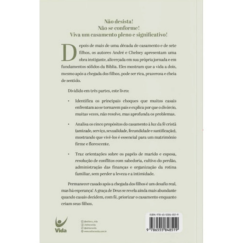 Livro Ainda Somos Nós? | André Costa e Chelsey Costa Encontrando a Plenitude do Casamento Após os FilhosAndré Costa e Chelsey CostaEm "Ainda Somos Nós?", André e Chelsey Costa compartilham sua experiência de mais de uma década de casamento e a criação de sete filhos, oferecendo uma perspectiva realista e encorajadora para casais que desejam manter seu relacionamento forte e significativo mesmo após a chegada dos filhos. Com base em fundamentos bíblicos e em sua própria jornada, os autores mostram que é possível viver um casamento pleno, prazeroso e cheio de propósito, mesmo em meio aos desafios da parentalidade. Este livro é dividido em três partes essenciais, que abordam desde os choques comuns enfrentados pelos casais até a redescoberta dos propósitos do casamento e a aplicação de princípios práticos para o dia a dia. Uma obra honesta e inspiradora, que combina relatos pessoais, conselhos práticos e orientação espiritual para fortalecer laços e reacender a intimidade. O que você vai encontrar neste livro: Identificação de Desafios: Os principais choques na transição para a parentalidade e por que o divórcio não é a soluçãoOs 5 Propósitos do Casamento: Amizade, serviço, sexualidade, fecundidade e santificação como alicerces de uma união florescenteGuia Prático: Orientações sobre papéis conjugais, resolução de conflitos, perdão, finanças e organização familiarFoco na Intimidade: Como cultivar leveza, conexão e cumplicidade mesmo na correria do dia a diaFundamento Bíblico e Esperança: A graça de Deus como base para recomeços e decisões firmes na vida a doisIdeal para: Casais em qualquer fase do relacionamento, especialmente os que estão se preparando para ou já têm filhosGrupos de estudo e discipulado para casaisLíderes e conselheiros matrimoniaisPessoas que desejam investir em um casamento que honre a Deus e seja fonte de alegria mútuaAdquira já "Ainda Somos Nós?" e descubra como, com fé e intencionalidade, é possível não apenas permanecer juntos, mas cultivar um casamento que floresce e inspira! Especificações do livro Ainda Somos Nós? | André Costa e Chelsey Costa: Título:Ainda Somos Nós? | André Costa e Chelsey CostaSubtítulo:Encontrando a Plenitude do Casamento Após os FilhosAutor(es):André Costa e Chelsey CostaAno de Edição:2025Capa:BrochuraPáginas:264Dimensões:23 x 15 x 1,7 cmPeso:0,390 gISBN:9786555848519Editora:Vida