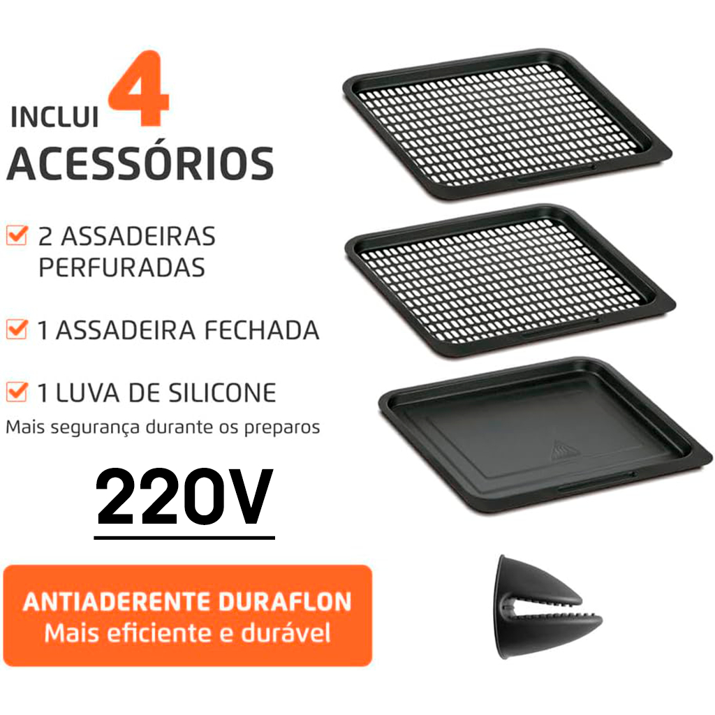 AIR FRYER FORNO OVEN MONDIAL 12L AFON-12L-RI (220V) 2200W VERMELHO/INOX | PAINEL DIGITAL 10 FUNÇÕES | CESTO 5L + 2 ASSADEIRAS ⚠️ VOLTAGEM: 220V (NÃO é bivolt) — não use em 127V 🔥 Mais praticidade na cozinha: Air Fryer + Forno em um só aparelho. Frite sem óleo, asse, gratine e reaqueça com rapidez — com capacidade grande de 12L para preparar porções maiores para a família. ✅ PRINCIPAIS VANTAGENS ✅ 2 em 1 (Air Fryer + Forno): mais versatilidade para o dia a dia ✅ Capacidade total de 12L: espaço interno amplo para receitas maiores ✅ Painel digital com 10 funções pré-programadas (1 toque): • Batata • Frango • Carne • Peixe • Camarão • Pão de Queijo • Pizza • Bolo • Legumes • Reaquecer ✅ Acessórios inclusos: 1 cesto de 5L + 2 assadeiras antiaderentes (use em níveis diferentes) ✅ Antiaderente Duraflon: evita que grude e facilita MUITO a limpeza ✅ Iluminação interna + visor amplo: acompanhe o preparo sem abrir a porta ✅ Potência 2200W: aquecimento rápido e cozimento uniforme 📌 COMPATIBILIDADE (LEIA ANTES DE COMPRAR) ✅ Ideal para: batata, frango, carnes, legumes, pão de queijo, pizza, bolo e reaquecer ⚠️ Por ser um produto de alta potência, use tomada/circuito em bom estado (evite benjamim/adaptadores/extensões). 🧾 ESPECIFICAÇÕES TÉCNICAS • Marca/Modelo: Mondial AFON-12L-RI (Linha Oven) • Capacidade total: 12 litros • Capacidade do cesto: 5 litros • Potência: 2200W • Voltagem: 220V (não bivolt) • Painel: digital com display LED • Temperatura: ajustável até 200°C • Timer: até 90 minutos (com desligamento automático) • Cor: Vermelho e Inox • Dimensões aprox.: 39 x 32 x 36 cm (A x L x P) • Acessórios: 2 assadeiras + 1 cesto + 1 bandeja coletora 🛠️ COMO USAR (PASSO A PASSO) 1) Conecte na tomada 220V 2) Coloque o alimento no cesto ou nas assadeiras (sem ultrapassar a capacidade) 3) Escolha uma função pronta ou ajuste tempo/temperatura 4) Acompanhe pelo visor com iluminação interna 5) Ao finalizar, aguarde esfriar e faça a limpeza (antiaderente Duraflon facilita) 🧼 LIMPEZA (SEM ESTRAGAR O ANTIADERENTE) • Espere esfriar totalmente • Lave cesto/assadeiras/bandeja coletora com esponja macia + detergente neutro • Evite palha de aço/abrasivos ❓ PERGUNTAS FREQUENTES (FAQ) 1) É bivolt? Não. Este modelo é 220V. 2) Qual a capacidade? 12L no total e cesto de 5L. 3) Quais funções já vêm no painel? Batata, Frango, Carne, Peixe, Camarão, Pão de Queijo, Pizza, Bolo, Legumes e Reaquecer. 4) Qual a temperatura máxima e o timer? Até 200°C e timer de até 90 minutos, com desligamento automático. 5) Vem com acessórios? Sim: 2 assadeiras + 1 cesto + 1 bandeja coletora. 📦 CONTEÚDO DA EMBALAGEM • 1x Air Fryer Forno Oven Mondial 12L AFON-12L-RI (220V) 💬 DÚVIDA DE VOLTAGEM OU USO? Chame no chat antes de comprar — ajudamos rapidinho.
