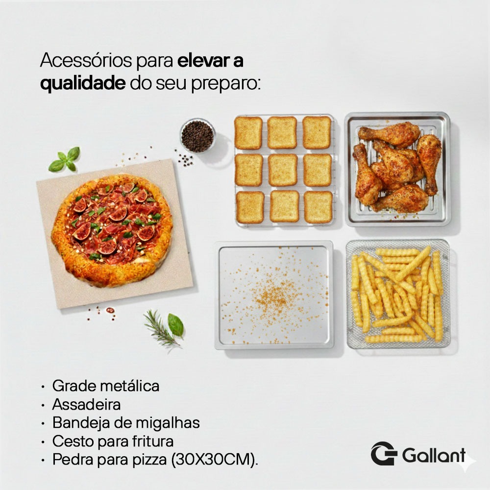A AirFryer Gallant Pizza MultiOven é a escolha ideal para quem busca praticidade, saúde e versatilidade na cozinha. Com capacidade de 18,3 litros e funções pré-programadas, ele permite preparar desde pizzas crocantes até carnes suculentas, bolos fofinhos e vegetais grelhados, tudo de forma rápida e sem a necessidade de óleo. Diferente de outros modelos do mercado, o Gallant acompanha uma pedra para pizza quadrada de 30x30 cm, que garante assados mais uniformes e crocância especial. Vale lembrar: para utilizar a pedra é necessário untá-la antes do uso, potencializando ainda mais o resultado final. Compacto, moderno e de fácil manuseio, o forno conta com painel digital interativo, funções práticas e acessórios completos, como bandeja de assar, grelha, bandeja de migalhas e a exclusiva pedra de pizza. Tudo para transformar sua rotina culinária em momentos de sabor e eficiência. Características do produto • Capacidade de 18,3 litros: ideal para preparar refeições completas para toda a família. • Pedra para pizza quadrada (30x30 cm): assa de forma uniforme e garante crocância, sendo um diferencial em relação às pedras redondas tradicionais. • Funções pré-programadas: pizza, airfryer, assar, torrar, desidratar, fermentar, descongelar e manter aquecido. • Painel digital intuitivo: opções de temperatura, tempo, iniciar/pausar/cancelar, controle de luz e ventilador, além de botão giratório e liga/desliga. • Ampla faixa de temperatura (30°C a 230°C): adapta-se a diferentes tipos de preparo. • Acessórios inclusos: bandeja de assar, grelha, bandeja de migalhas e pedra de pizza. • Potência de 1700W: alto desempenho para um preparo rápido e eficiente. • Design moderno e funcional: com luz interna, aviso sonoro e desligamento automático. • Multifuncionalidade: prepara pizzas, carnes, frangos, peixes, vegetais, bolos, pães e muito mais. Dúvidas Frequentes 1. Preciso untar a pedra de pizza antes de usar? Sim, para garantir maior durabilidade e evitar que os alimentos grudem, é recomendado untar a pedra antes de cada uso. 2. Esse forno substitui uma airfryer tradicional? Sim. Ele possui função airfryer e pode preparar alimentos crocantes e saudáveis, com menos óleo. 3. Posso preparar bolos e massas doces nele? Sim, a ampla variação de temperatura e as funções de assar permitem preparar bolos, muffins e massas doces com ótimo resultado. 4. O forno possui desligamento automático? Sim, além do aviso sonoro, o equipamento desliga automaticamente ao final do preparo. 5. Ele é adequado para cozinhas pequenas? Sim, seu design compacto (50,4 x 37,6 x 19,7 cm) facilita a acomodação em diferentes espaços, sem perder desempenho. Especificações Técnicas Marca: Gallant Modelo: GFE18OPTA-PT220 Tipo: Sem Óleo Capacidade Total: 18,3 L Cor: Preto Tensão: 220V (não é bivolt) Tipo de Tomada: 10A (220V) Funções Pré-Programadas: Pizza / Airfryer / Assar / Torrar / Desidratar / Fermentar / Descongelar / Manter Aquecido Funções no Painel: Temperatura / Tempo / Iniciar, Pausar e Cancelar / Luz e Ventilador / Botão Giratório / Liga e Desliga Acompanha Acessórios: Bandeja de Assar / Grelha / Bandeja de Migalhas / Pedra para Pizza Potência: 1700W Timer: Sim Temperatura Min/Máx: 30 – 230 °C Comprimento do Cabo Elétrico: 1 m Frequência: 60 Hz Aviso Sonoro: Sim Luz Interna: Sim Luz Indicadora de Funcionamento: Sim Painel Digital: Sim Desligamento Automático: Sim Material: Aço Tipos de Alimentos que Comporta: Pizza / Batatas fritas / Frango / Carne / Canapés / Peixe / Vegetais / Bolos / Muffins / Massas doces / Pão Dimensões da Pedra: 30 x 30 cm Dimensões do Cesto (C x L): 33,2 x 29 cm Dimensões Internas (C x L x A): 33,3 x 32,6 x 16,8 cm Dimensões do Produto (C x L x A): 50,4 x 37,6 x 19,7 cm Dimensões da Caixa (C x L x A): 56,8 x 44 x 28,5 cm Peso Líquido: 6,5 kg Peso Bruto: 7,7 kg Garantia: 12 meses