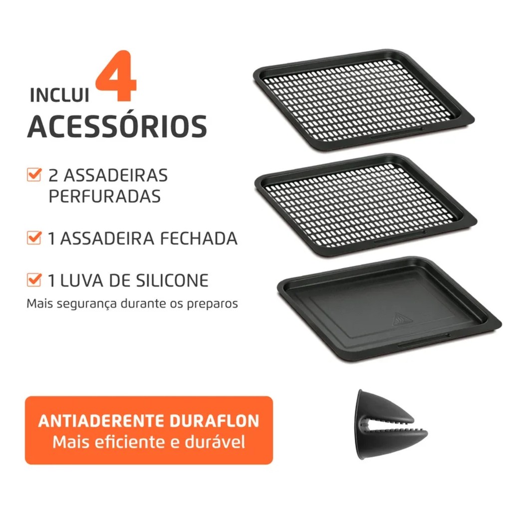 Air Fryer Fritadeira Forno Oven 2000W 12L AFON-12L-AB 110V Mondial CARACTERÍSTICAS: - Garantia: 3 Meses - Tipo: Air Fryer Oven (Fritadeira + Forno) - Modelo: AFON-12L-AB - Potência: 2000W - Tensão: 110V - Frequência: 60 Hz - Consumo aproximado: 2,0 kW/h - Capacidade total: 12 Litros - Capacidade do cesto: 5 Litros - Formato do cesto: Quadrado - Temperatura máxima: 200°C - Painel: Analógico - Timer: Até 60 minutos - Tecnologia: Circulação de ar quente (sem óleo) - Funções: Assa, frita, cozinha e gratina - Material: Polipropileno (PP) e Inox - Cor: Preto e Inox - Tipo de tomada: 20A - Peso aproximado: 7,62 kg - Dimensões aproximadas: 36,1 x 36 x 32 cm (L x A x P) - Certificação: Inmetro UL-BR 24.0596 - Marca: Mondial DETALHES: - A Air Fryer Oven Mondial AFON-12L-AB é a solução ideal para quem busca praticidade, versatilidade e alimentação mais saudável no dia a dia. - Com tecnologia 2 em 1, combina a eficiência da fritadeira a ar com a capacidade e funcionalidade de um forno, permitindo preparar diversas receitas em um único equipamento. - Possui alta potência de 2000W, garantindo preparo mais rápido e eficiente dos alimentos. - A circulação de ar quente permite fritar, assar e cozinhar sem a necessidade de óleo, proporcionando refeições mais saudáveis e saborosas. - Conta com capacidade total de 12 litros, ideal para preparar porções maiores ou refeições completas para toda a família. - O cesto de 5 litros e as assadeiras permitem preparar diferentes alimentos ao mesmo tempo, otimizando o tempo na cozinha. - O painel analógico com controle de temperatura e timer de até 60 minutos oferece mais precisão no preparo das receitas. - Possui visor frontal com iluminação interna, facilitando o acompanhamento do preparo sem precisar abrir o equipamento. - O design moderno em preto e inox agrega sofisticação à cozinha, além de garantir resistência e durabilidade. - Acompanha acessórios completos que aumentam a versatilidade no preparo de diferentes pratos. - Ideal para quem busca praticidade, economia de tempo e uma alimentação mais saudável no dia a dia. CONTEÚDO DA EMBALAGEM: - 1 Air Fryer Oven Mondial - 1 Cesto - 2 Assadeiras - 1 Assadeira coletora - 1 Luva de silicone - 1 Livro de receitas - 1 Manual de instruções