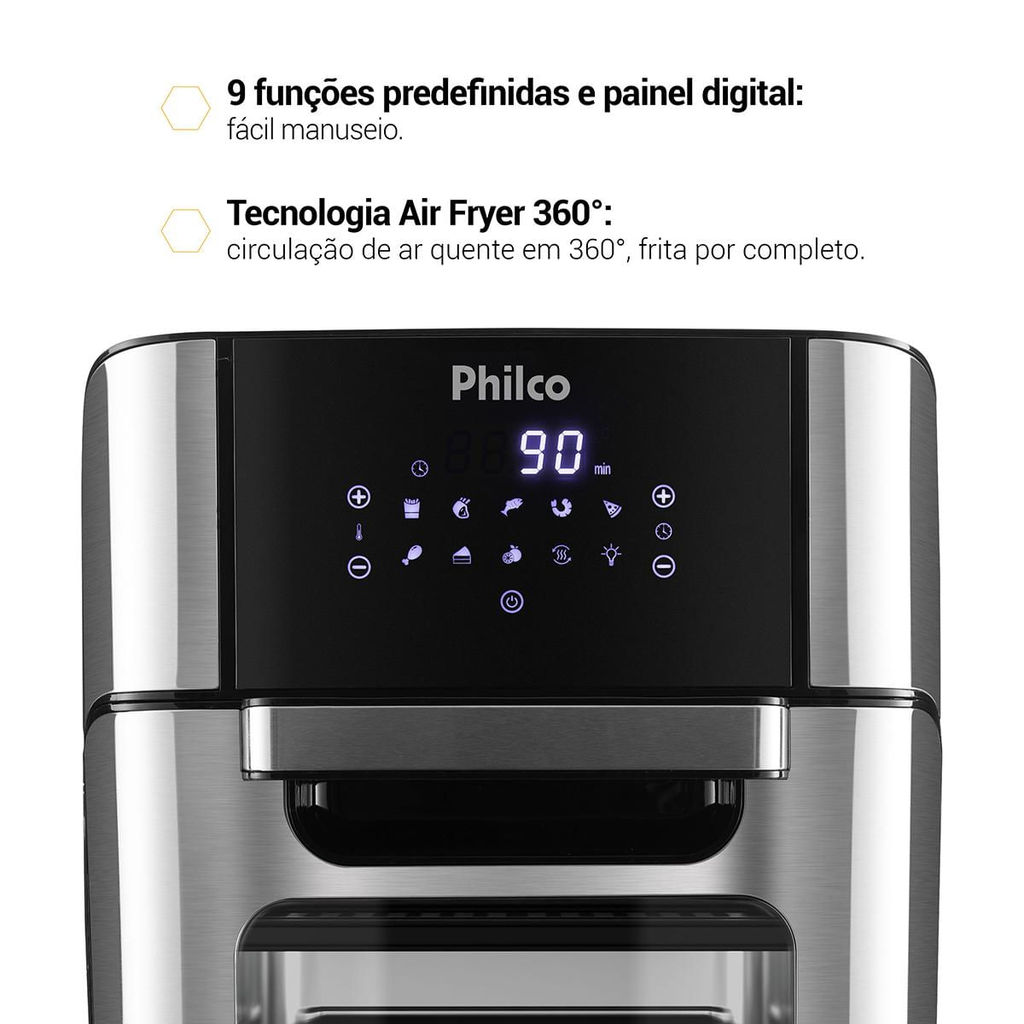 Transforme sua rotina na cozinha com sabor, saúde e estilo! A Air Fryer Oven Philco 12L 4 em 1 PFR2200P é a aliada perfeita para quem ama praticidade sem abrir mão de sabor. Com design moderno em inox e painel digital touch, a Air Fryer Oven Philco combina a eficiência da fritadeira sem óleo com a versatilidade de um forno elétrico. Prepare porções generosas para toda a família, realce sabores com a função Desidratar e redescubra o prazer de cozinhar de forma leve e descomplicada. A Air Fryer Oven PFR2200P conta com 9 funções pré-programadas, controle de temperatura de 80 graus a 200 graus, timer de 90 minutos e uma luz interna que permite acompanhar cada preparo. O resultado? Pratos dourados, crocantes e deliciosos, com muito mais praticidade. E o melhor: Air Fryer Oven Philco 12L 4 em 1 1800W PFR2200P vem com acessórios completos e proteção contra superaquecimento, garantindo segurança e durabilidade em cada uso. Mais sabor, menos óleo e zero complicação. Potência de 1800W Capacidade total de 12L 4 em 1: frita, assa, desidrata e reaquece Painel digital com 9 funções pré-programadas Controle de temperatura: 80 graus a 200 graus Timer de 90 minutos com desligamento automático Função Desidratar (2h a 24h / 30 graus a 80 graus) Acabamento em inox e luz interna Proteção contra superaquecimento Base antiderrapante Acompanha: 2 assadeiras rasas, 1 cesto antiaderente 3,5L e 1 bandeja coletora