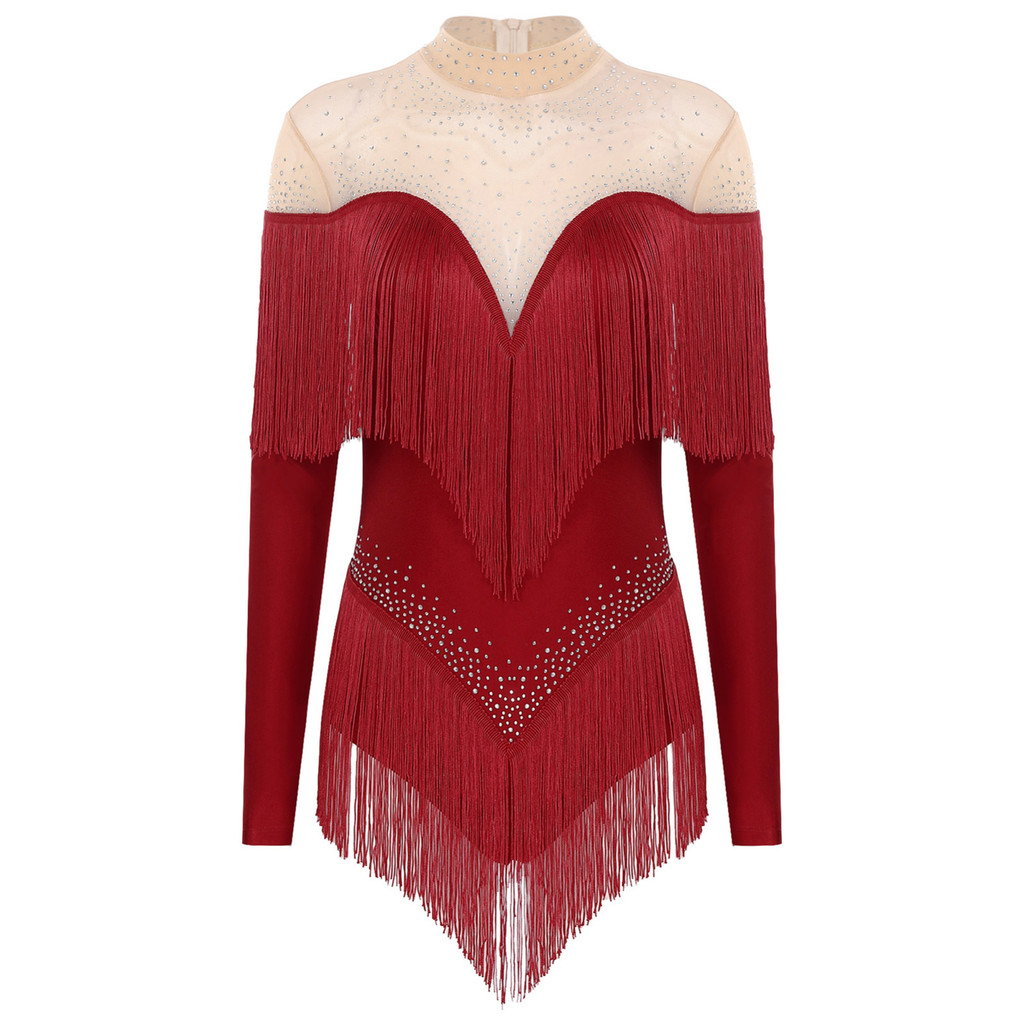 Aislor Feminino Borla Dança Latina Collant Palco Desempenho Traje Simulado Pescoço Manga Longa Pura Malha Retalhos Brilh