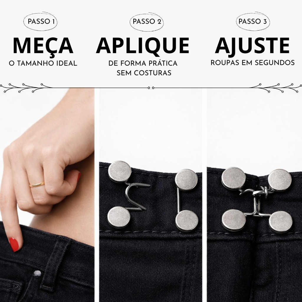 🔥 ENTREGA RÁPIDA - ESTOQUE PRÓPRIO 🔥 🔒 PRODUTO DE QUALIDADE COM NF 🔒 Calça larga na cintura? Quer ajustar SEM costura de forma rápida e prática? Chega de roupas desconfortáveis ou gastar com ajustes! Com o nosso Kit Ajustador de Cintura com 2 conjuntos de peças, você ajusta os dois lados da roupa em segundos — com praticidade, conforto e segurança. ✨ Benefícios que você vai amar: ✅ Encaixe rápido e firme – Não precisa de ferramentas 👖 Compatível com jeans, brim e tecidos grossos 🔄 Removível e reutilizável – use em diferentes roupas 😎 Discreto e eficiente – pode ser usado por dentro 🧵 Sem danos ao tecido – design que protege sua peça ❓ Perguntas Frequentes (FAQ) "O ajustador fica visível na roupa?" Fica praticamente invisível quando usado na parte interna da roupa. "Funciona em tecidos mais grossos como jeans?" Sim! Ele foi feito justamente para funcionar bem em jeans e tecidos encorpados. "É fácil de colocar?" Muito fácil. É só encaixar e travar – sem precisar costurar ou usar ferramentas. "Vai estragar ou marcar o tecido da roupa?" Não. O design foi pensado para proteger o tecido e evitar qualquer dano. "O kit vem com 1 ou 2 conjuntos de peças?" Vem com 2 conjuntos de peças, ideal para ajustar os dois lados da cintura. Botão Mágico Ajustável Calça Jeans | Redução De Cintura Sem Costura Kit | Ajustador De Cintura Para Calça Jeans | Botão Metal Reutilizável | Kit Botão Ajustável Para Jeans | Aperta Calça Sem Costura | Redutor De Cintura Calça Jeans | Botão Regulável Fácil Instalação | Botão Extra Ajustável Calça Feminina | Solução Rápida Sem Costura