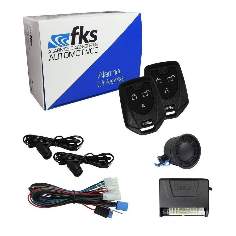 O alarme FKS FK902SB Plus tem muita qualidade, diversas funcionalidades e ainda oferece um custo-benefício excelente. Mesmo sendo recheado de funções, ele é super prático de usar, e tudo isso para evitar com máxima eficiência qualquer tentativa de furto do seu automóvel. Para isso, ele conta com recursos para travar e destravar as portas, subir vidro elétrico, rearme automático, sensores de ultrassom e muito mais. Informações Técnicas: • Função desliga rádio integrada com saída positiva. • Tamanho compacto. • Comando de travas negativo. • Travamento automático de portas após a ignição ser ligada. • Auxiliar 1 - Sobe vidro inclusive das marcas FIAT e VW com vidros automatizados, subida e descida original de fábrica. • Auxiliar 2 - Desce vidro ou abre o porta-malas. Sensor de ultrassom com ajuste de sensibilidade. • Funções programáveis: seleção de tempo de travamento, seleção do tom da sirene, arme automático, rearme automático, cancelamento de ultrassom. • Outras funções: pânico, localizador e check control. • Sirene dedicada. Obs.: Não tem a função de bloqueio. Itens inclusos: • 1 Módulo Central • 1 Sirene • 2 Controles remotos (modelo CR941 Preto) 1 Tecla de programação • 2 Cápsulas de ultrassom • 1 Manual de instruções • 1 Certificado de Garantia • 1 Chicote e Fios