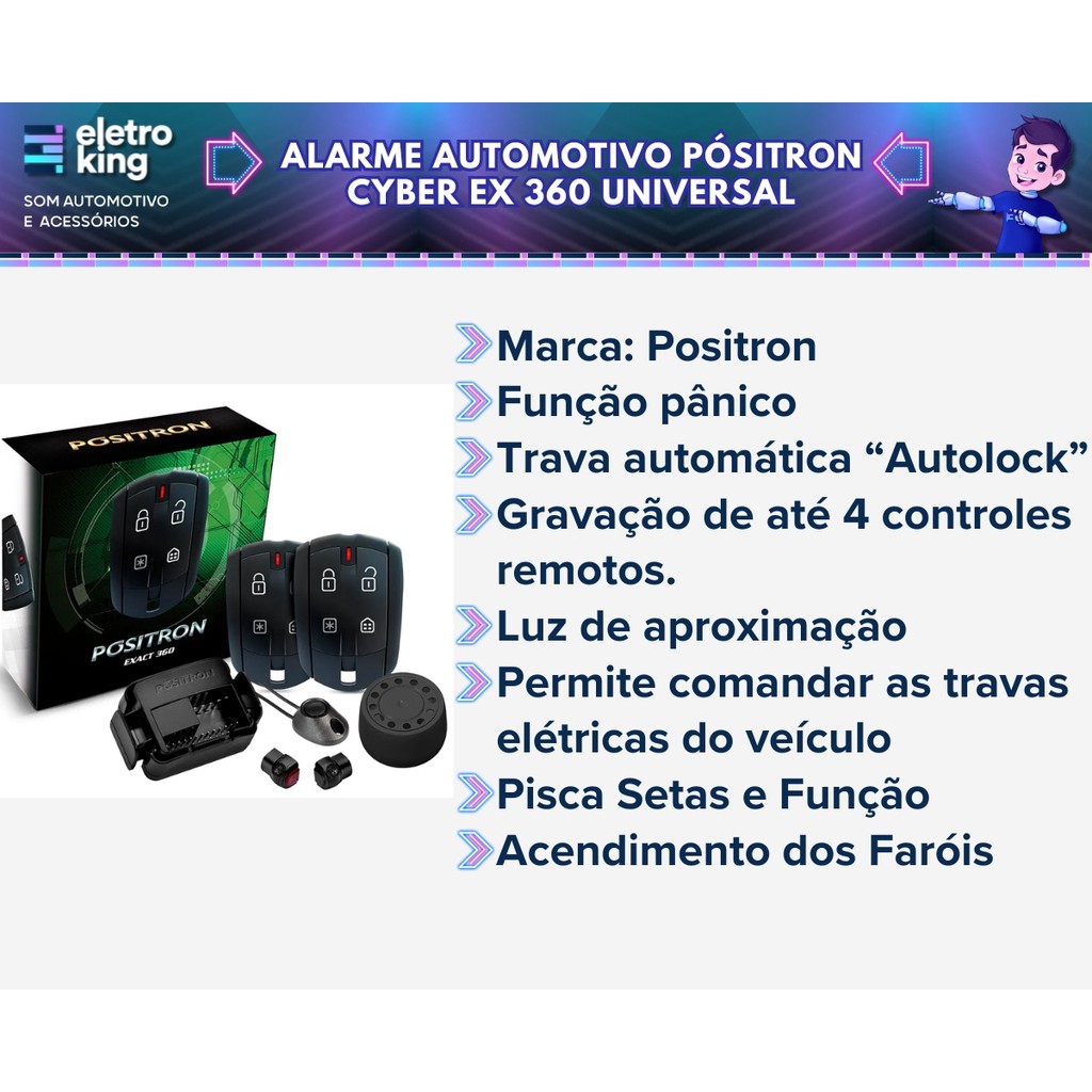 Seja bem-vindo a Eletroking, leia atentamente a descrição do produto abaixo antes da compra, qualquer dúvida, nos acione no campo de perguntas do anúncio. Alarme Positron EX360 Blade Com Chave Canivete + Módulo de Vidros Soft AW52R 2 Portas Linha Renault A Pósitron apresenta a linha de Alarmes Cyber 360, projetada para oferecer mais segurança e conforto para veículos de 12 volts. Com funções como controle remoto para acionar vidros, som automotivo e portão eletrônico, o alarme também conta com reativação automática e bloqueio de combustível. Entre suas características está a função de piscar as setas para localizar o veículo e um botão secreto para maior proteção, incluso uma chave canivete PX80. Para aumentar a segurança, o módulo de subida de vidro AW52R fecha automaticamente os vidros ao ativar o alarme. Ele é compatível com a maioria dos veículos e possui sistema antiesmagamento, que interrompe o fechamento em caso de obstáculos. Foi desenvolvido especialmente para os veículos Renault ou sistemas com descanso positivo. Conta com Antiesmagamento que utiliza o sistema NoShunt, muito mais seguro e com menor índice de falha Especificações Técnicas: Alarme Positron EX360 Universal • Aplicação: Universal • Controle de Som: Liga e Desliga o Som pelo Alarme • Função Pânico: Pressionando o Botão Liga do Controle Remoto por 5 Segundos • Cancelamento Temporário do Sensor de Ultrassom • Pisca Setas e Função Acendimento dos Faróis • Trava Automática “Autolock”: Função que Possibilita o Travamento das Portas em 5 Segundos após a Ignição ter sido Ligada e Destrava as Portas ao Desligar a Ignição • Luz de Aproximação • Módulo com Exclusiva Tecnologia ASIC: Circuito Integrado que torna o Módulo mais Resistente às Interferências Eletromagnéticas e evita Disparos Falsos • Exclusivo Controle Remoto com Tecnologia ASIC: Compatível com Qualquer Bateria do Mercado • 01 Saída Auxiliar que Possibilita a Descida dos Vidros Elétricos (Inclusive Originais) ou Abertura do Porta-malas¹ (Requer módulos e/ou relês adicionais.) • Exclusiva Tecnologia PAN (Pósitron Area Network), que Permite que o Alarme seja compatível com outros Produtos da Linha Pósitron • Gravação de Até 4 Controles Remotos • Sirene com Volume de Som mais Alto, mas que atende às normas do Contran² (Acompanha suporte metálico.) • Disparo do Alarme em Caso de retirada as Cápsulas Receptoras de Ultrassom • Permite comandar as Travas Elétricas do veículo por Controle Remoto • Permite Cancelar o Beep ao Ativar e Desativar o Alarme pelo Controle • Reativa Automaticamente o Alarme ao Desativá-lo caso Ninguém entre no Veículo • Beep Personalizado ao Ativar e Desativar o Alarme (6 opções diferentes) • Possibilidade de Monitorar o Interior do Veículo através do Ultrassom com LED Externo e Interno • Função que Permite acionar o Portão Eletrônico³ (Requer utilização de módulo PG150, não acompanha módulo) • Função Bloqueio, permite o bloqueio da bomba de combustível ou do motor de partida, o EX360 não possui relé de bloqueio interno, sendo necessário utilizar um relé externo de 20A(não fornecido no kit do alarme) é encontrado na loja onde for instalar o alarme. Módulo subida/descida aw52r de vidro elétrico soft 2 portas • Central para 2 Vidros Elétricos • Contagem de Pulso Digital • Diversos Algorítimos para Contagem de Pulso • 100% Compatível com Configurador BlueSOFT • Mais de 500 Ajustes Configuráveis Possíveis • Consumo Abaixo de 2mA • Função Antiesmagamento • Exclusiva Função 100Force • Subida e Descida Automática • Compatível com Botões Resistivos • Compatível com Botões Baixa/Alta Corrente Pulso Positivo • Temporização Integrada • Mapeamento Automático • Botões Remotos Inteligentes • Alivio de Pressão Conteúdo da Embalagem: • 01 Módulo AW52R Soft • 01 controles PX80 canivete (não acompanha lâmina) • 01 controles PXN convencional • 01 Módulo • 01 Sirene • 01 Chicote • Kit de Instalação • Manual e Certificado de Garantia Importante: • Garantia de 273 dias. • Valor Do Kit • Todos os Nossos Produtos São Novos, Originais e Acompanham Nota Fiscal. • A Eletroking recomenda que a instalação seja feita por profissional especializado e não se responsabiliza pelo mau uso do produto.