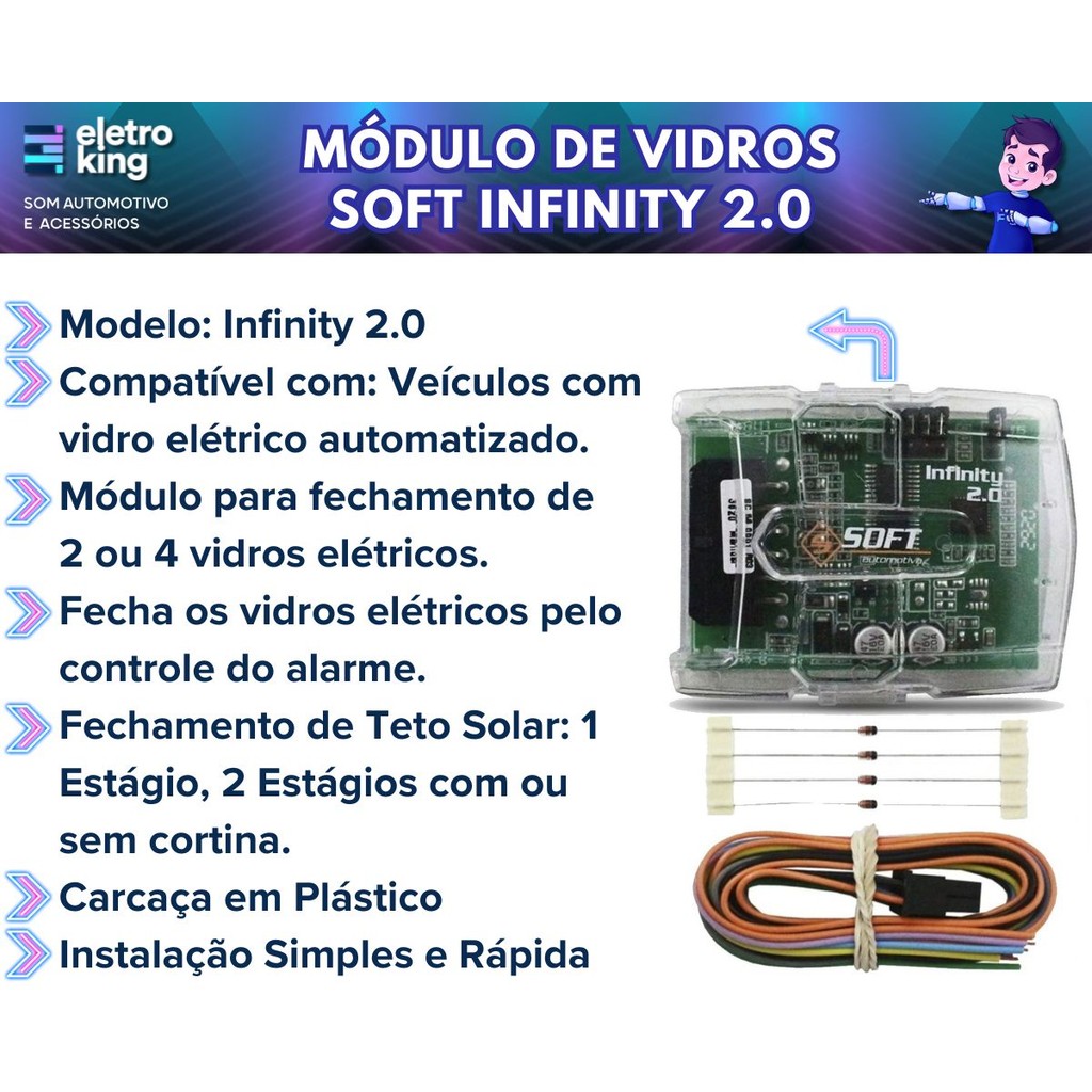 Alarme Positron EX360 Blade Com Chave Canivete + Módulo de Vidros Soft Infinity 2.0 Garanta a máxima segurança e praticidade para o seu veículo com o Alarme Positron EX360 Blade, que oferece um sistema de proteção eficiente, além da conveniência da Chave Canivete, que une tecnologia e estilo em um único acessório. Complementando a segurança, o Módulo de Vidros Soft Infinity 2.0 proporciona a funcionalidade de subir e descer os vidros do carro diretamente pelo controle, aumentando ainda mais o conforto e a proteção do seu automóvel. Com esses dois componentes, você oferece o que há de melhor em proteção e conveniência para o seu veículo Especificações Técnicas: Alarme Para Carros 12v Positron EX360 Blade • Alimentação 12 volts • Aplicação universal compatível com veículos 12 volts disponíveis no mercado brasileiro • Aplicação universal o alarme automotivo Cyber Ex360 blade é 100 por cento compatível com veículos 12 volts disponíveis no mercado brasileiro. • Controle de som ao desligar o carro e ativar o alarme, o som é desligado automaticamente. Ao desativar o alarme e abrir a porta, o som é ligado automaticamente. • Cancelamento temporário do sensor de ultrassom por meio do controle remoto, para situações em que não se deseja detectar movimento dentro do carro, ao ativar o alarme. • Luz de aproximação acendimento das setas por 10 segundos ao pressionar o botão desliga duas vezes do controle remoto. • Função pânico pressionando o botão liga do controle remoto por 5 segundos, causará o disparo do alarme. • Pisca•setas caso você não se lembre onde seu carro está estacionado, esta função permite piscar as setas do veículo pressionando o botão auxiliar do controle remoto por 3 segundos com o alarme ativado. • Trava automática Autolock função que possibilita o travamento das portas em 5 segundos, após a ignição ter sido ligada, e destrava as portas ao desligar a ignição. • Módulo com exclusiva Tecnologia ASIC Application Specific Integrated Circuit, circuito integrado que torna o módulo mais resistente às interferências eletromagnéticas e evita disparos falsos. • Controles remotos com Sistema Pósitron anticlonagem New Flex•Code 3. • 1 saída auxiliar que possibilita a descida dos vidros elétricos inclusive originais ou abertura do porta•malas. • Função acendimento dos faróis e lanternas. Ao ligar a ignição e/ou o motor entrar em funcionamento, os faróis e lanternas acenderão automaticamente. • Exclusiva Tecnologia PAN Pósitron Area Network, que permite que o alarme automotivo Cyber EX360 se comunique com outros produtos da linha Pósitron. • Gravação de até 4 controles remotos. • Pulso de vidro específico para os veículos Gol G6/Fox 2012 em diante e Novo Uno 2015 em diante permite acionar os vidros e travas sem a necessidade de módulos e/ou reles adicionais. • Exclusivo controle remoto com Tecnologia ASIC Application Specific Integrated Circuit, compatível com qualquer bateria do mercado, proporcionando maior estabilidade no link de sinal de presença entre controle e módulo. • Sirene com volume de som mais alto, mais nítido e tamanho reduzido, atendendo às normas do Contran. • Disparo do alarme em caso de retirada da cápsula receptora de ultrassom. • Permite comando das travas elétricas do veículo por controle remoto. • Permite cancelar o bipe ao ativar e desativar o alarme pelo controle. • Rearme automático do alarme, se não houver abertura de portas ou se os sensores de ultrassom não detectarem movimento. • Acompanha um controle convencional PXN62 e um controle canivete PX80. • Longo alcance dos controles remotos, em conformidade com as normas da Anatel. • Bipe personalizado ao ativar e desativar o alarme 6 opções diferentes. • Monitoramento do interior do veículo por meio dos sensores de ultrassom fixados no para-brisa. • Algumas das funções dependem das características do veículo e/ou relés ou módulos adicionais. • A função presença vem desabilitada de fábrica. Para utilizar o recurso, é necessário habilitar a função. Necessário que o controle tenha o recurso de presença. Módulo De Vidro Elétrico Original E Teto Solar Infinity 2.0 • Modelo: Infinity 2.0 • Compatível com: Veículos com Vidro Elétrico Automatizado • Módulo para Fechamento de 2 ou 4 Vidros Elétricos • Fecha os Vidros Elétricos pelo Controle do Alarme • Fechamento de Teto Solar: 1 Estágio, 2 Estágios Com ou Sem Cortina • Carcaça em Plástico • Para Veículos com Vidro Elétrico Automatizado • Mais Segurança e Praticidade • Instalação Simples e Rápida Conteúdo da Embalagem: • 01 controle PXN convencional • 01 controle PX80 canivete sem a lâmina • 01 Módulo Central • 01 Sirene • 02 Sensores internos • 01 Módulo Soft Infinity 2.0 • Chicotes de Instalação • Manual e Certificado de Garantia Importante: • Garantia de 273 Dias. • Valor do Kit.