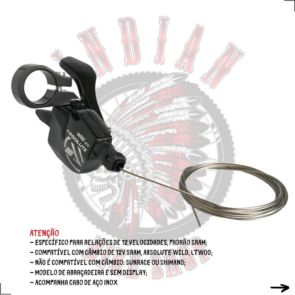 ALAVANCA CAMBIO ABSOLUTE WILD 2 TRASEIRO DIREITO 12V - ABRAÇADEIRA S/ DISPLAY - OEM SEM CAIXA **Lançamento 2024** ATENÇÃO: - Compatível com câmbio de 12v SRAM, ABSOLUTE WILD, ABSOLUTE WILD 2, LTWOO; - NÃO é compatível com câmbio: SUNRACE ou SHIMANO; - Modelo de abraçadeira e sem display; - Acompanha Cabo de Aço Inox. Descrição: A alavanca ABSOLUTE WILD 2 é uma ótima opção para a montagem com os câmbios traseiros SRAM, ABSOLUTE WILD, ABSOLUTE WILD 2, LTWOO de 12v. As trocas de marchas são feitas APENAS com dedo POLEGAR. Sobe até 04 posições de marchas com um movimento completo da alavanca e desce 01 posição de marcha por acionamento. A alavanca segue com cabo de aço instalado, a fixação é por abraçadeira e NÃO tem display indicador de posição de marchas. Especificações: - Marca: ABSOLUTE; - Linha: WILD 2 – Lançamento 2024; - Modalidade: MTB – XC, TRAIL; - Específico para relações de 12 velocidades; - Compatível com câmbio de 12v SRAM, ABSOLUTE WILD, ABSOLUTE WILD 2, LTWOO; - NÃO é compatível com câmbio: SUNRACE ou SHIMANO; - Sistema RapdFire; - Tecnologia: Desce marchas com o dedo POLEGAR / Sobe até 04 marchas com um movimento completo com o POLEGAR; - Display de Marchas: NÃO; - Lado: Direito; - Fixação: ABRAÇADEIRA; - Material: Alumínio, Aço Inox e Plástico; - Cor: Preto; - Peso aproximado: 145g; - Origem: CHINA; - Cód. Barras: 6940194030923. Atenção: - Acompanha Embalagem Original - Saco Plástico; - Produto original ABSOLUTE; - Importado por ISAPA; - Garantia de 90 dias; - Acompanha nota fiscal. Aguardamos o seu pedido! INDIAN BIKE SHOP