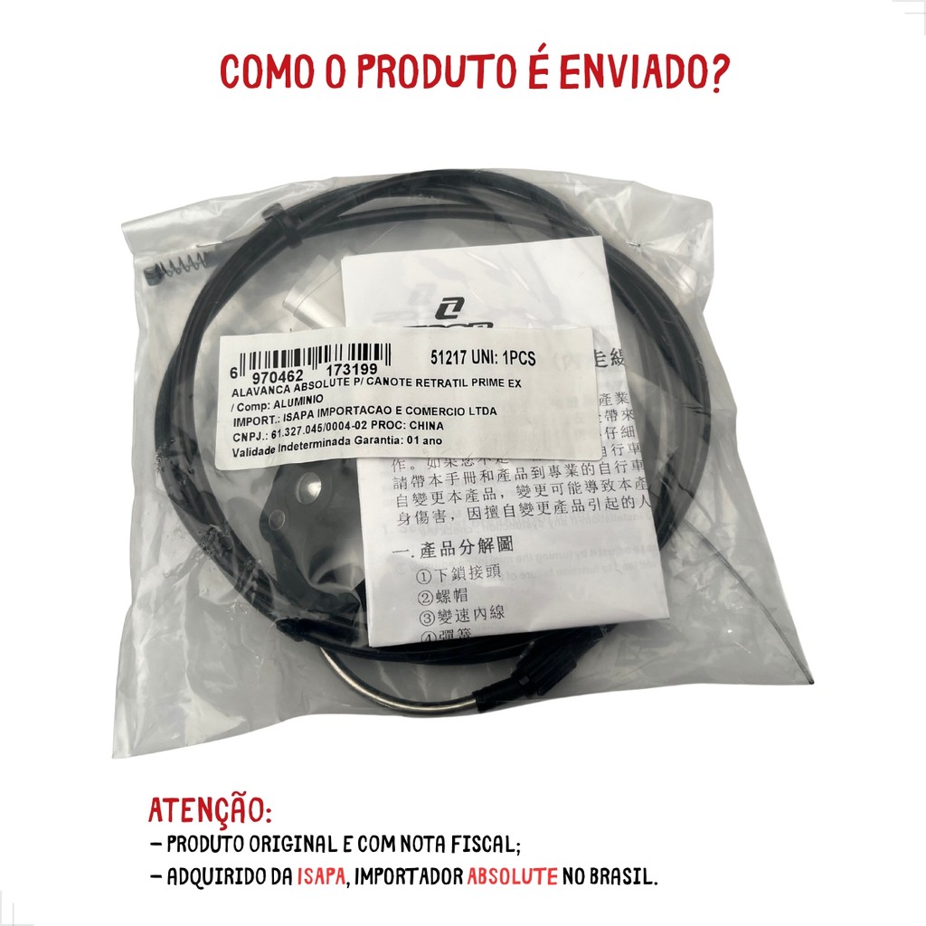Alavanca Gatilho Absolute para Canote Retrátil Prime EX – Compatível com Guidões de 22,2 mm Desenvolvida para oferecer mais controle, eficiência e praticidade na operação do seu canote retrátil. Produzida em alumínio e aço de alta resistência, garante durabilidade e performance, mesmo nas trilhas mais desafiadoras. Diferenciais do Produto: - Alavanca tipo gatilho com acionamento suave e preciso - Abraçadeira articulada com diâmetro de 22,2 mm – compatível com a maioria dos guidões - Instalação versátil: pode ser montada em ambos os lados do guidão - Compatível com qualquer modelo de canote retrátil que utilize cabo preso na alavanca - Acompanha conduíte com regulagem e travas, facilitando o ajuste fino do sistema Benefícios para o Ciclista: Maior praticidade no controle do canote retrátil durante o pedal Acionamento mais ergonômico com retorno rápido Instalação simples e segura com todos os componentes inclusos Especificações Técnicas: - Marca: Absolute (Linha Zoom) - Modelo: Prime EX - Material: Alumínio e aço - Cor: Preto - Peso da alavanca: 30 g - Fixação: Abraçadeira articulada de 22,2 mm - Compatibilidade: Canotes retráteis com acionamento por cabo Conteúdo da Embalagem: - 1 alavanca gatilho para guidão - 1 conduíte com regulagem - Travas da alavanca - Manual de instalação GARANTIA E PROCEDÊNCIA: - Garantia Absolute de 90 dias; - Produto original ABSOLUTE; - Importado por ISAPA; - Acompanha nota fiscal. Aguardamos o seu pedido! Equipe INDIAN BIKE SHOP