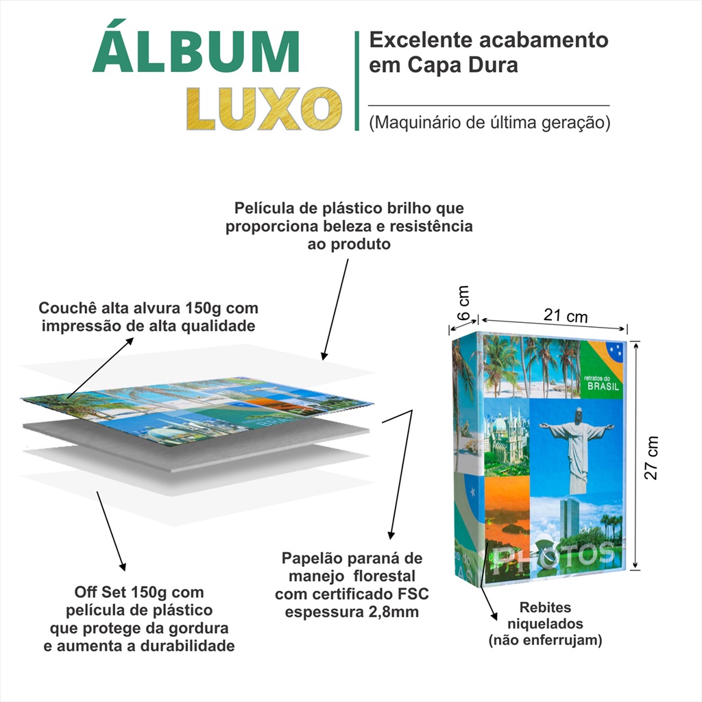 ATENÇÃO!!!! -> O VALOR DO ANÚNCIOCORRESPONDE A 1 ALBUM 10X15, FERRAGEM COM ATÉ 300 FOTOS 10X15. O ALBUM DO ANÚNCIO VEM COM PLASTICO PARA 200 FOTOS 10X15. SE QUISER COLOCAR MAIS FOTOS PRECISA COMPRAR UM REFIL COM LINK ANEXO https://shopee.com.br/product/519102714/16412094619/ DESPACHO EM 24 HORAS ! TEM ALGUMA DÚVIDA. FAÇA-NOS UMA PERGUNTA ! IMPORTANTE !!! FAVOR ESCOLHER O MODELO( CAPA) NA HORA DA COMPRA. VEJA VARIAÇÕES EM CORES DIFERENTES LOGO ACIMA DO BOTÃO AZUL DE COMPRAS. SÓ ADICIONAR NO CARRINHO DE COMPRAS SE QUISER COMPRAR VÁRIOS MODELOS. DESCRIÇÃO: ÁLBUM DE FOTOS PARA GUARDAR E PROTEGER SUAS RECORDAÇÕES. OS ALBUNS DE COURO COSTURADOS POSSUIEM CAPAS MACIAS E ALMOFADAS, ISSO PORQUE ELA E COSTURADA DE COURO SINTETICO E PREENCHIDA COM ESPUMA INTERNAMENTE. PRODUTO DE QUALIDADE E DURABILIDADE, FABRICADA COM OS MELHORES MATERIAS DO MERCADO. O SISTEMA DE FERRAGEM PERMITE A INCLUSÃO DE MAIS FOLHAS PARA AMPLIAR O NUMERODE FOTOS. TEM CAPACIDADE PARA ATÉ 300 FOTOS 10X15 ( 4 FOTOS POR PAGINA) POSSUI MEMO CENTRAL PARA DESCRIÇÃO DAS SUAS FOTOS PLASTICO DE POLIPROPILENO TRANSPARENTE QUE PROTEGE AS FOTOS. NUNCA USE PVC!! FICHA TÉCNICA- ALBUM DE PAPELAO PARANA DURO COSTURADA COM COURO SINTÉTICO E PREENCHIDA COM ESPUMA INTERNAMENTE. PARTE INTERNA COM 50 FOLHAS PLÁSTICAS DE POLIPROPILENO COM FUROS PARA FERRAGEM DE 3 ARGOLAS PARA 200 FOTOS 10X15 COMPRIMENTO : 520 MM (ABERTO) 220MM (FECHADO) LARGURA : 80 MM ALTURA : 270 MM UTILIZE O CARRINHO DE COMPRAS E APROVEITA O FRETE GRÁTIS . PARA ISSO BASTA NAVEGAR POR NOSSOS ANÚNCIOS E ADICIONAR AO CARRINHO OS PRODUTOS DESEJADOS UM DE CADA VEZ. DÚVIDAS FREQUENTES: PERGUNTA :O ALBUM DO ANUNCIO É PARA QUANTAS FOTOS? RESPOSTAO ALBUM É PARA 200 FOTOS 10X15 HISTÓRIA CLIP O suíço, Alexander Buholzer decidiu quando mais velho vir a America do sul. O clima e a recepção dos brasileiros fizeram com que o Brasil se destacasse entre os outros países, e , portanto em 1994, escolheu ficar e montar sua empresa nesta linda terra tropical. Alex desde pequeno tinha um grande interesse em guardar todos os retratos da sua família, principalmente, porquê sem estas fotos não existiriam histórias . Assim nasceu a empresa Clip juntos com ela todos os seus álbuns, porta retratos e produtos para guardar suas melhores lembranças de vida................