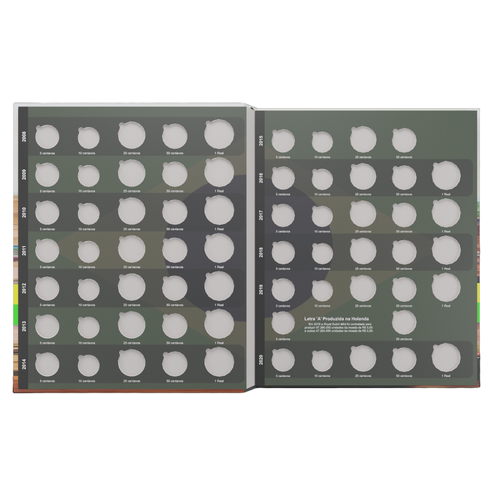 Álbum para as moedas do Plano Real possui medida 21 x 26cm, 8 paginas, contendo espaços para todas as moedas circulante da família do real -Primeira família -Segunda família ate 2038 -0,05 e 0,50 produzidas na Holanda Comemorativas: -FAO, 10 e 25 centavos -Olimpíadas -Direitos Humanos -Banco central 40 e 50 anos -Beija flor, 25 anos do plano real -Juscelino Kubitschek Agora ficou fácil organizar suas moedas com esse incrível álbum compacto e com belíssimo acabamento. Contem papelão super reforçado na capa e em todas as paginas. peso 850g. Delia Moedas Organizer