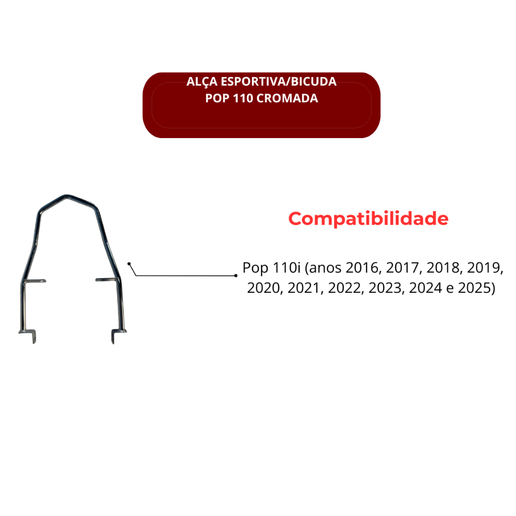 🏍️ ALÇA POP BICUDA/ESPORTIVA 110 -16/25 - Características Técnicas Modelo: Bicuda / Esportiva Compatível: Pop 110i (anos 2016, 2017, 2018, 2019, 2020, 2021, 2022, 2023, 2024 e 2025) Material: Aço de alta resistência Acabamento: Pintura eletrostática (evita ferrugem e desgaste) Instalação: Simples e rápida, sem adaptações Funções: Apoio para garupa, auxílio em manobras e visual esportivo ❓ – Perguntas Frequentes 1. Essa alça serve em quais modelos de moto? Ela é compatível com a Pop 110i dos anos 2016 até 2025. Não serve para outros modelos como a Pop 100. 2. É resistente? Sim! É feita em aço de alta resistência, com pintura eletrostática que protege contra ferrugem e desgaste. 3. Qual a função da alça? Serve como apoio para o garupa, ajuda a levantar ou manobrar a moto com mais facilidade e também deixa o visual mais esportivo.