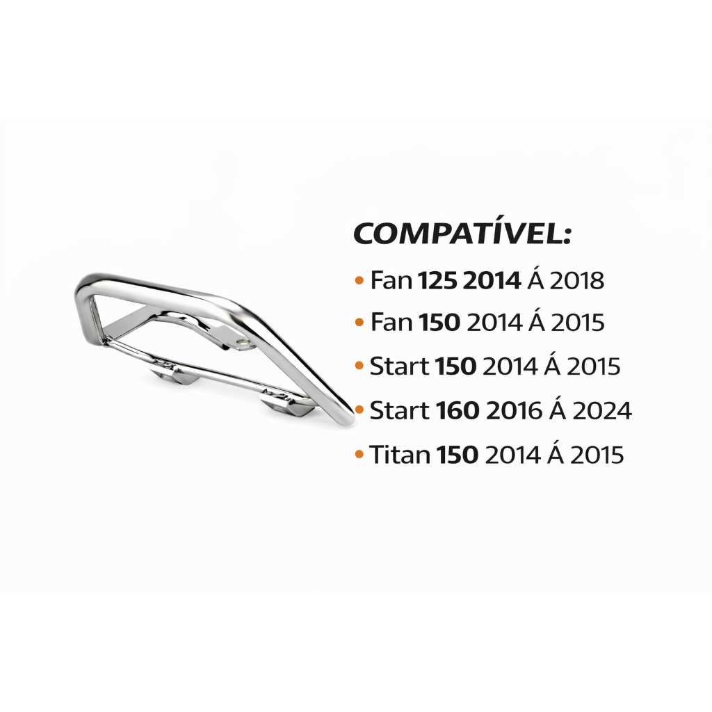 Alça Vertical Baixa Fan 160/150 - Start 160/150 - Titan 150 COMPATÍVEL: - Fan 160 2015 até 2023 - Fan 150 2014 e 2015 - Start 160 2015 até 2023 - Start 150 2015 - Titan 150 2014 a 2015 Alça Traseira Esportiva Cromada - Fácil instalação sem adaptação. - Encaixe com os parafusos original da sua moto. CARACTERÍSTICAS: - Excelente qualidade e durabilidade do cromo - Incrementa a traseira da moto - Protege a rabeta da moto - Proporciona mais conforto ao garupa