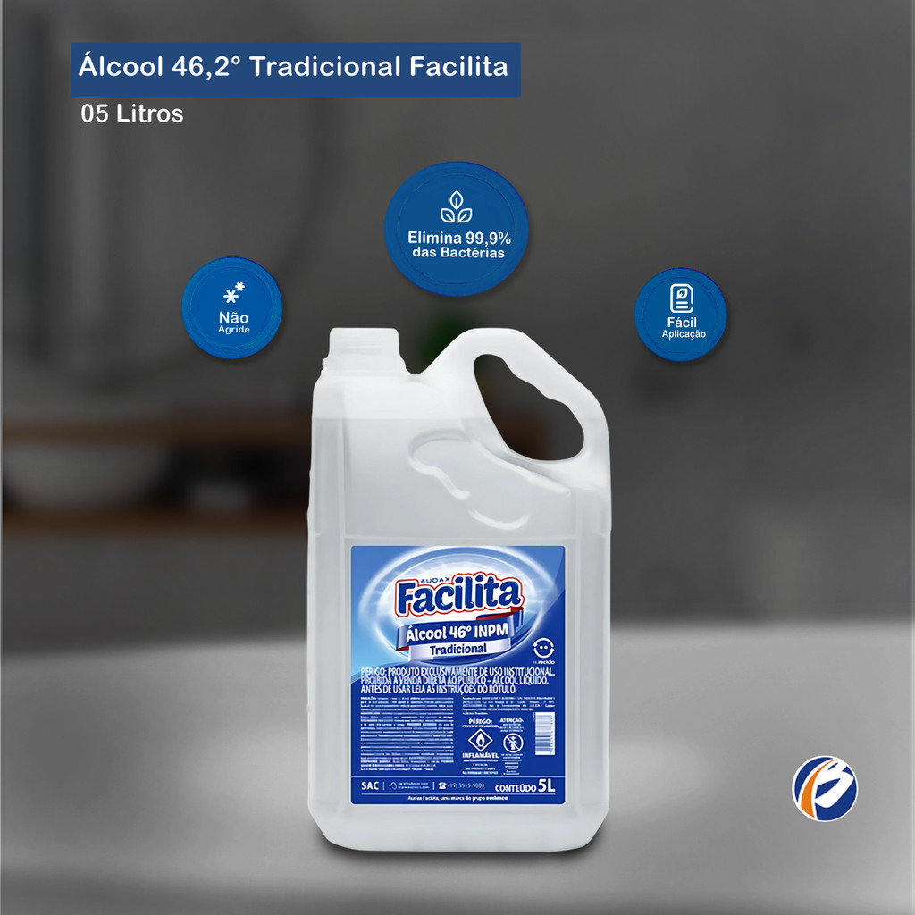 Álcool Líquido 46,2° Tradicional 5L Facilita Limpador à base de álcool, utilizado para limpeza doméstica em geral, de fácil aplicação e sem agressão às superfícies. Sua concentração oferece um equilíbrio eficaz entre poder de limpeza e segurança, sendo adequada para a eliminação de germes e microrganismos sem danificar superfícies sensíveis. Indicação de Uso: - Ideal para limpeza de vitrines, espelhos, vidros, pisos, fórmicas, azulejos, bancadas de mármore, equipamentos e utensílios. Tipo: Líquido Embalagem: 01 Galão de 5L