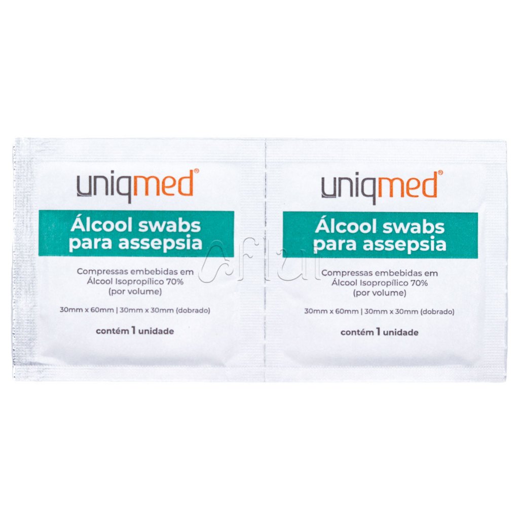 ÁLCOOL SWABS PARA ASSEPSIA UNIQMED Caixa com 100 unidades | Embalados individualmente (sachê de alumínio) Compressa com duas camadas – 30x60mm Os Swabs embebidos em Álcool são indicados para assepsia e prevenção de contaminação bacteriana em aplicações endovenosas e subcutâneas. :: COMPOSIÇÃO: > Compressa com duas camadas > Composição do lenço: Terileno – 40% / Algodão 55 g/m² – 60% > Embebido em: Álcool Isopropílico 70% / Água 30% :: INSTRUÇÕES DE USO: 1- Abra o sachê que envolve o Swab e retire-o com cuidado; 2- Realize adequadamente a assepsia na área desejada; 3- Descarte imediatamente. :: CARACTERÍSTICAS: > Marca: UNIQMED > Medida: 30mm X 60mm > Medida: 30mm X 30mm (dobrado) > Cor: Branca > Origem: China > Quantidade: 100 unidades/caixa > Camada Dupla > Ação Germicida > Validade: 5 anos :: CERTIFICAÇÕES DE QUALIDADE: > Registro: ANVISA 10098719003 :: CONDIÇÕES DE ARMAZENAMENTO: Armazenar em local fresco, seco, ventilado, afastado de fontes de calor e de ignição. Não deve ser misturado com material virulento, perigoso ou corrosivo. Não expor à luz solar direta. *Imagem meramente ilustrativa* *Imagem exclusiva com direitos autorais. Proibido o uso sem autorização do autor*