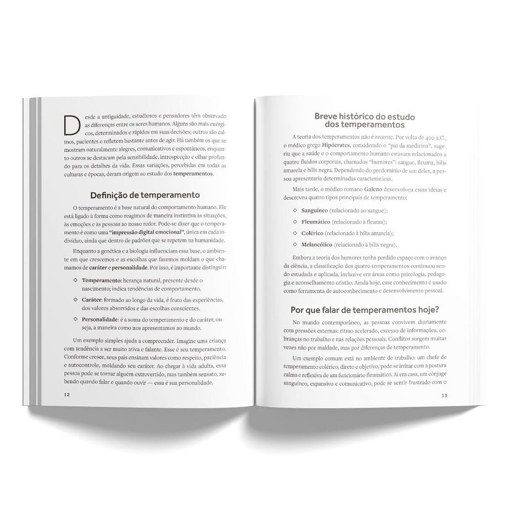 Você é mais do que o seu temperamento ― e a Bíblia revela uma transformação que vai muito além dos rótulos. Em tempos em que testes de personalidade e classificações emocionais se tornaram populares, muitos cristãos passaram a definir a si mesmos por conceitos como colérico, fleumático, melancólico ou sanguíneo. Mas a pergunta decisiva é: é assim que a Bíblia enxerga o ser humano? Este livro foi escrito para quem deseja compreender a identidade humana não a partir de limitações psicológicas, mas da ação transformadora de Deus. Além dos Temperamentos mostra que nossa vida não está condicionada ao que sentimos ou ao jeito como reagimos, e sim ao que o Senhor está formando em nós . Por que este livro é essencial para quem busca maturidade cristã? ✔ Vai além das classificações emocionais ― Revela que a Bíblia não trata pessoas como peças fixas, mas como vidas em processo de transformação ✔ Liberta da limitação dos rótulos ― Seus pontos fortes não são desculpa, e seus pontos fracos não são sentença; em Cristo, tudo pode ser renovado ✔ Traz base bíblica sólida e equilibrada ― Mostra o que as Escrituras realmente dizem sobre temperamentos e formação de caráter ✔ Aplica a verdade à vida diária ― Ajuda o leitor a crescer em maturidade, santidade e sem depender de definições humanas ✔ Inclui exemplos bíblicos transformadores ― Como Davi, Paulo, Moisés e Ester foram usados por Deus apesar (e não por causa) de seus perfis pessoais O que você encontrará neste livro? O conteúdo é organizado como uma jornada de autoconhecimento à luz da fé, dividida em três partes essenciais: Parte I ― O que são temperamentos e o que a Bíblia realmente diz sobre eles Uma análise clara e bíblica que desmonta ideias distorcidas e devolve o foco para a verdade das Escrituras Parte II ― Libertos de rótulos: quando Deus nos transforma além do que somos Um convite para abandonar limitações emocionais e abraçar a obra contínua do Espírito Parte III ― Desenvolvendo um caráter segundo Cristo: passos práticos Direções concretas para crescer em maturidade espiritual e viver a identidade que Deus constrói A cada página, o leitor descobre que não existe destino emocional definido ― existe processo, redenção e uma nova história sendo escrita por Deus. Para quem este livro foi escrito? Cristãos que desejam crescer em caráter e maturidade Pessoas cansadas de viver presas a rótulos emocionais Pais, professores e líderes que cuidam de outras vidas Conselheiros e pastores que desejam uma abordagem bíblica equilibrada Quem busca compreender o ser humano à luz das Escrituras, e não de teorias limitadas O diferencial desta obra Ao contrário de materiais que apenas descrevem perfis emocionais, Além dos Temperamentos apresenta uma visão bíblica que: trata o ser humano como alguém em transformação contínua, não define identidade pelo comportamento, coloca Cristo no centro da mudança verdadeira, e mostra que a formação de caráter é obra de Deus, não de rótulos psicológicos O resultado é uma leitura libertadora, profunda e extremamente prática ― que não apenas explica, mas transforma. Se você deseja viver além das limitações do seu temperamento, este livro será um marco na sua caminhada espiritual. 14x21cm 128 Páginas