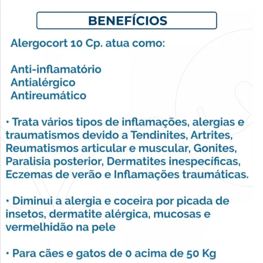 A MANADA ANIMAL é um marketplace de produtos veterinários. É a escolha certa para tutores que prezam pela qualidade dos produtos que seu animal necessita. Tudo com o suporte de uma equipe de veterinários e gestores com mais de 10 anos de experiência no mercado. Fique tranquilo, todos os nossos produtos são originais, adquiridos através de distribuidores credenciados! Ah, e todas as vendas acompanham nota fiscal! MANADA ANIMAL, Tranquilidade pra você, cuidado para ele! ______________________________________ ANTI-INFLAMATÓRIOS E ANTI-ALÉRGICOS Alergocort Antiinflamatório esteroidal » Pode ser usado por cães e gatos » Maior ação antiinflamatória com menor dose terapêutica » Melhor equilíbrio eletrolítico sem retenção de sódio. INDICAÇÕES Contra processos inflamatórios, alérgicos e reumáticos de cães e gatos. POSOLOGIA 1 comprimido ao dia para cada 5kg, podendo ser dividida a cada 12 horas. Animais até 2,5 kg ......................................... ½ comprimido Animais de 2,5 até 5 kg ................................... 1 comprimido Animais de 5 até 15 kg ................................... 2 comprimidos Animais de 15 até 50 kg .............................3 a 4 comprimidos Acima de 50 kg ..... 3 a 4 comprimidos para cada 50 kg de peso COMPOSIÇÃO Dexametasona