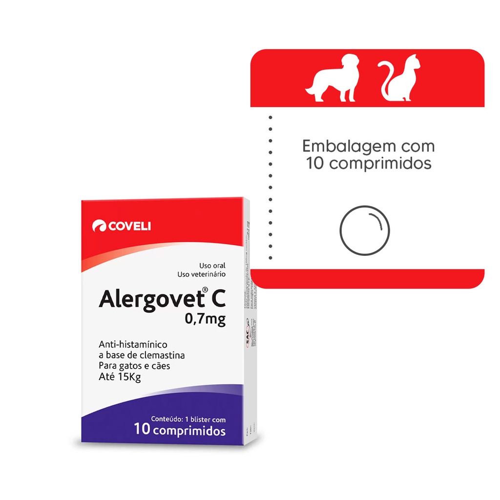 Alergovet C 0,7mg 10 Comp Para Gato Cachorro Até 15kg Coveli