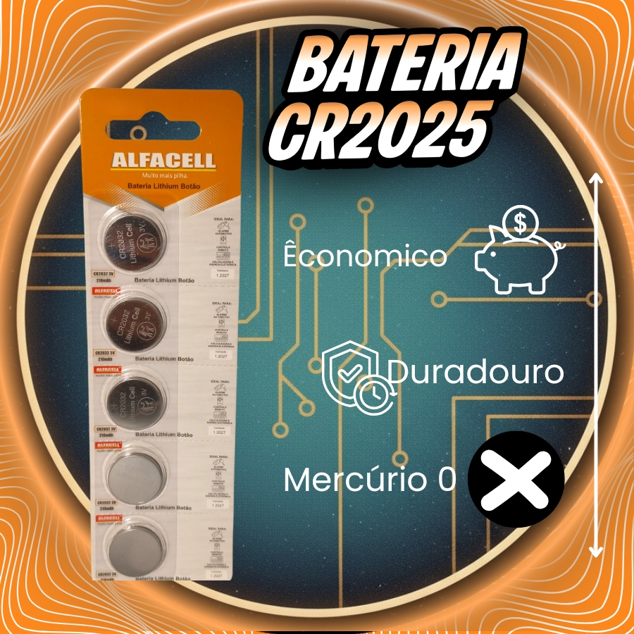 - Ideais para placas de computador, alarmes automotivos e relógios. - Duráveis e seguras - Alto padrão de qualidade APROVADAS PELO INMETRO - As Alfacell são testadas periodicamente por laboratórios credenciados pelo INMETRO, para garantir a qualidade e conformidade com a resolução Conama 401. ECOLOGICAMENTE CORRETAS - As CR2025 Alfacell tem 0% de Mercúrio e Cadmio em sua composição, colaborando para a preservação do meio ambiente. DURA + CUSTA - As CR2025 Alfacell foram aprovadas em todos os quesitos e têm ótima relação custo/benefício. Economize e tenha de qualidade.